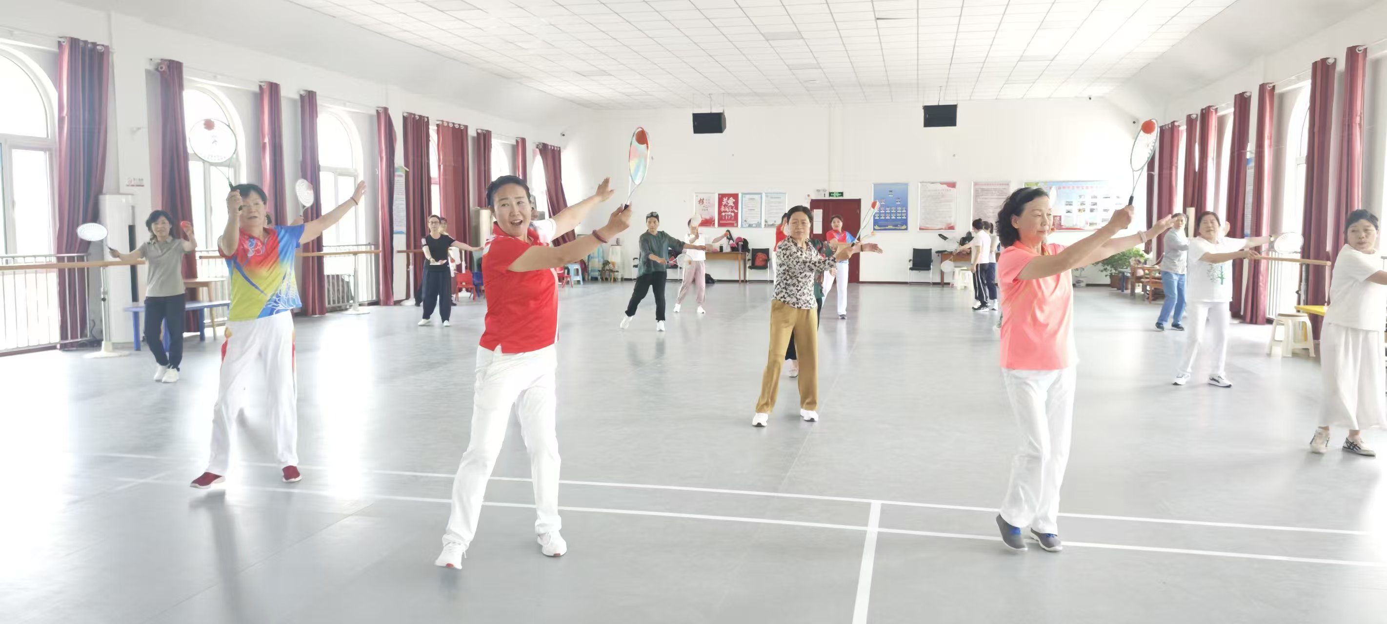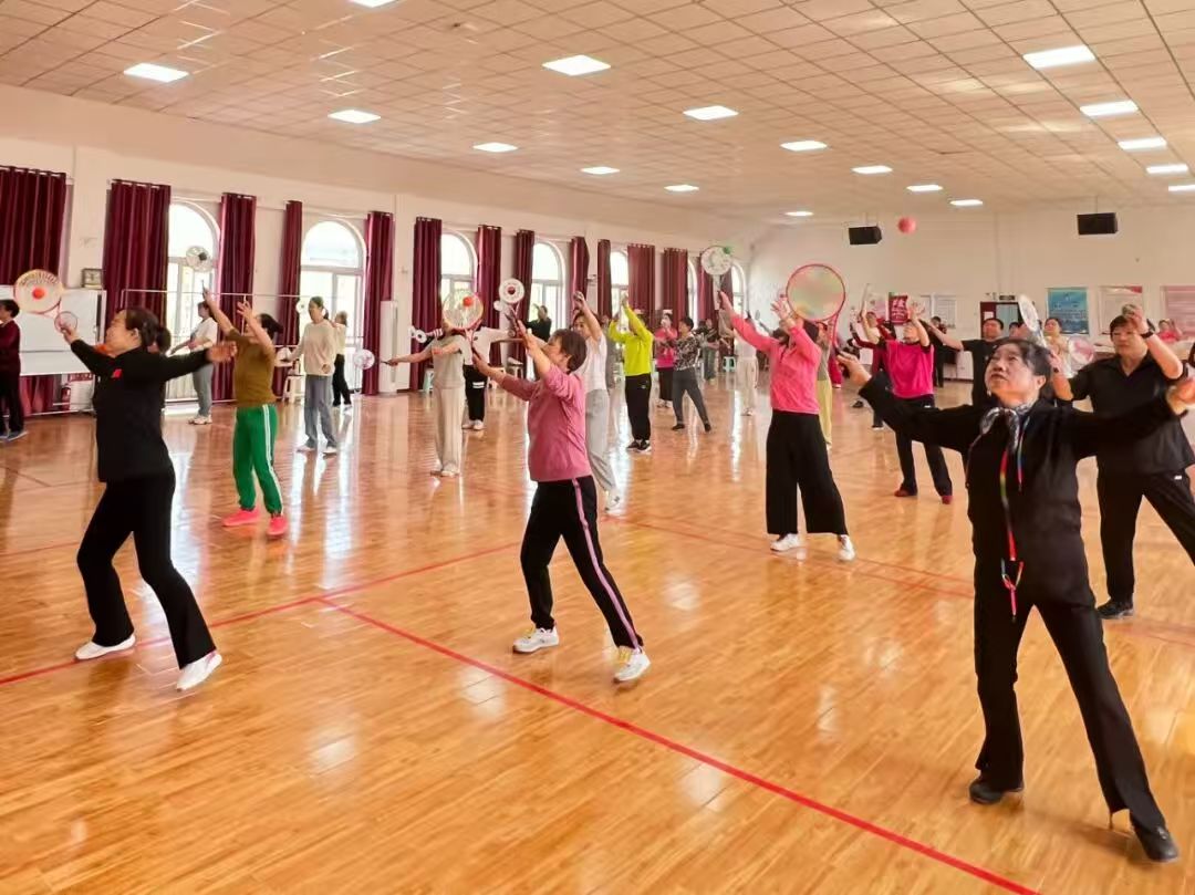 下午2点多,北七家镇文化中心2楼活动室里,舒缓的音乐缓缓流淌,二十余位老人手持柔力球拍,跟着口令舒展身姿。“迎——纳——引——抛——”队长王红霞口令清晰、节奏平稳,一边示范一边叮嘱:“沉腰、送拍、走弧线,力道要柔,动作要圆!”