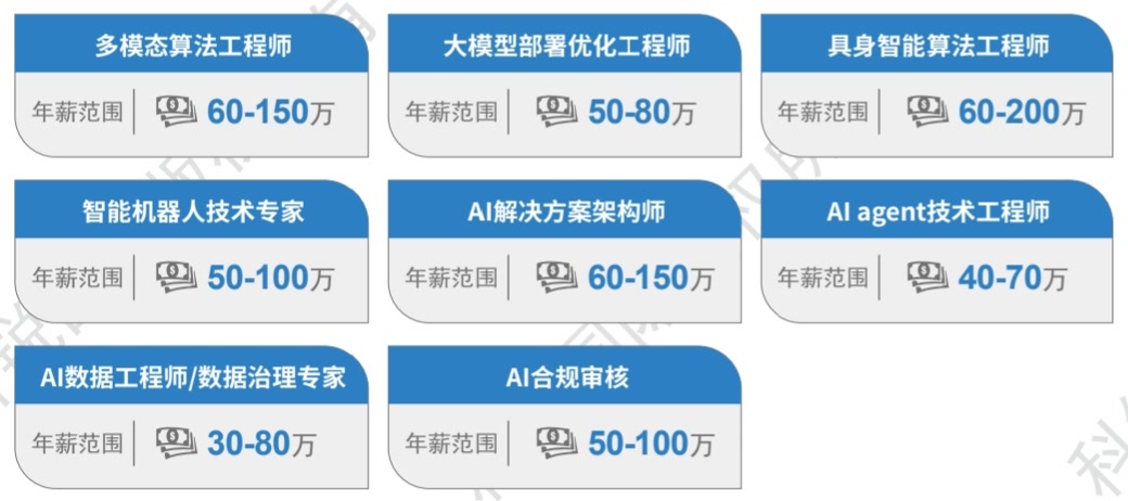 应用侧而言,“技术+业务”的复合型人才更受青睐,智能体开发工程师、AI解决方案架构师等岗位需求持续旺盛;而能将技术转化为商业价值、精准捕捉不同场景下用户需求的人工智能产品经理、产品解决方案专家,也成为市场稀缺的关键岗位,薪酬也水涨船高,如AI解决方案架构师年薪最高达150万元。