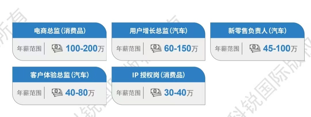 汽车与制造业领域,数字化营销、用户运营已成为竞争核心,整车厂与供应链企业纷纷加码引入懂内容、懂数据、懂转化的营销人才,以及具备渠道资源、跨平台运营能力的商业化负责人。薪酬层面,电商总监(消费品)年薪最高可达200万元,用户增长总监(汽车)年薪区间在60-150万元,IP授权岗年薪区间在30-40万元,新职业赛道的潜力持续释放。