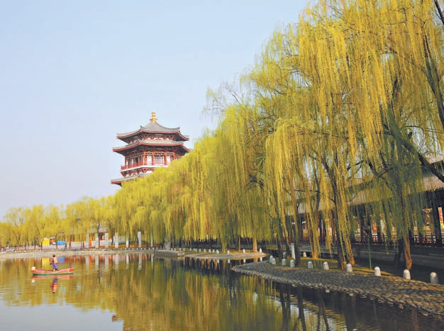 西安大唐芙蓉园周边的柳树与唐风古韵的建筑融合在一起,轻柔醉人。