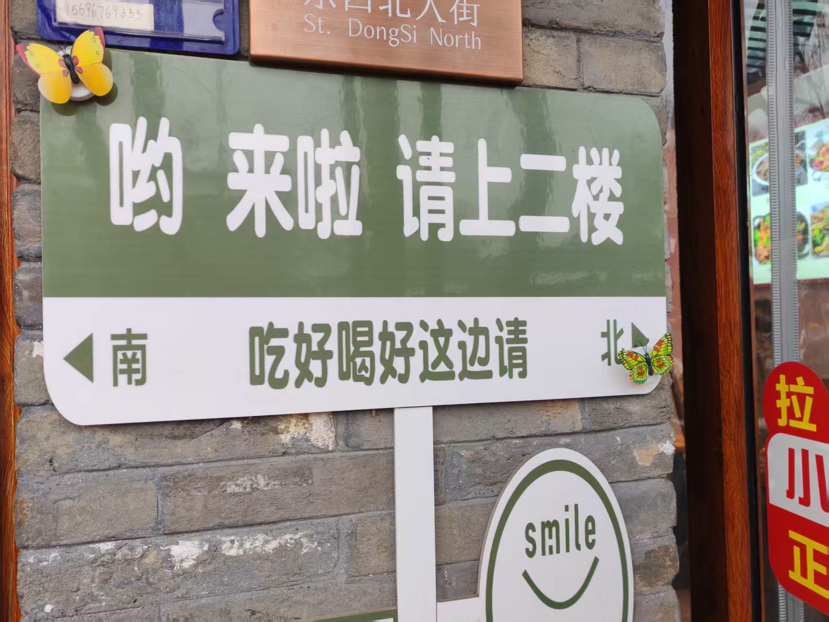 小店开张约半年,主营砂锅,有北京特色,总体上走的是亲民路线,价格实惠。刚开张的时候,除了店名里的儿化音,店面外观的视觉元素看不出太多北京痕迹。最近,老板定制了一块小标牌,带着京味儿热情的“呦,来啦,请上二楼”。顿时,让整个店面活跃起来。