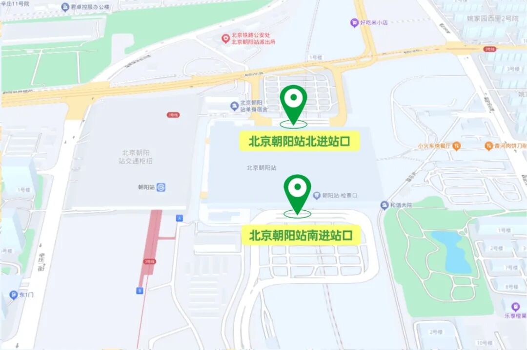 去往北京朝阳站乘车的小伙伴,可以搜索“北京朝阳站北进站口”或“北京朝阳站南进站口”可以到达二层南、北侧落客平台,进站安检后可直接进入候车大厅。