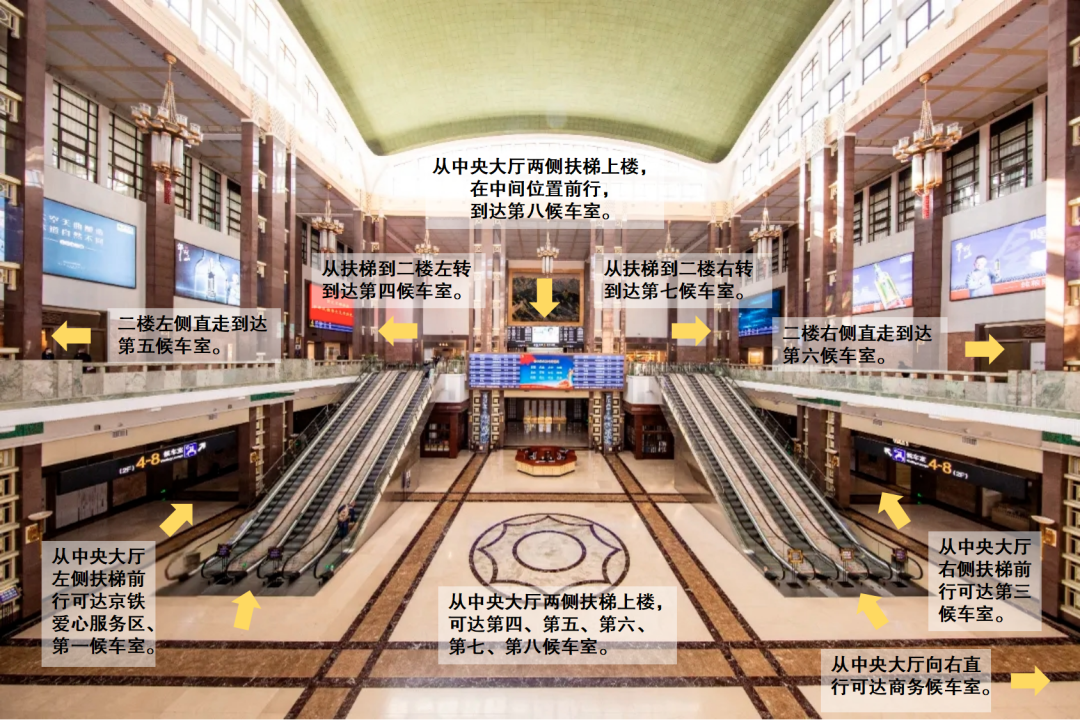 由东2F(进站口4)进站后,即可直接进入候车大厅。由南1(进站口1)进站后,需乘扶梯或无障碍电梯上行至二楼候车区。