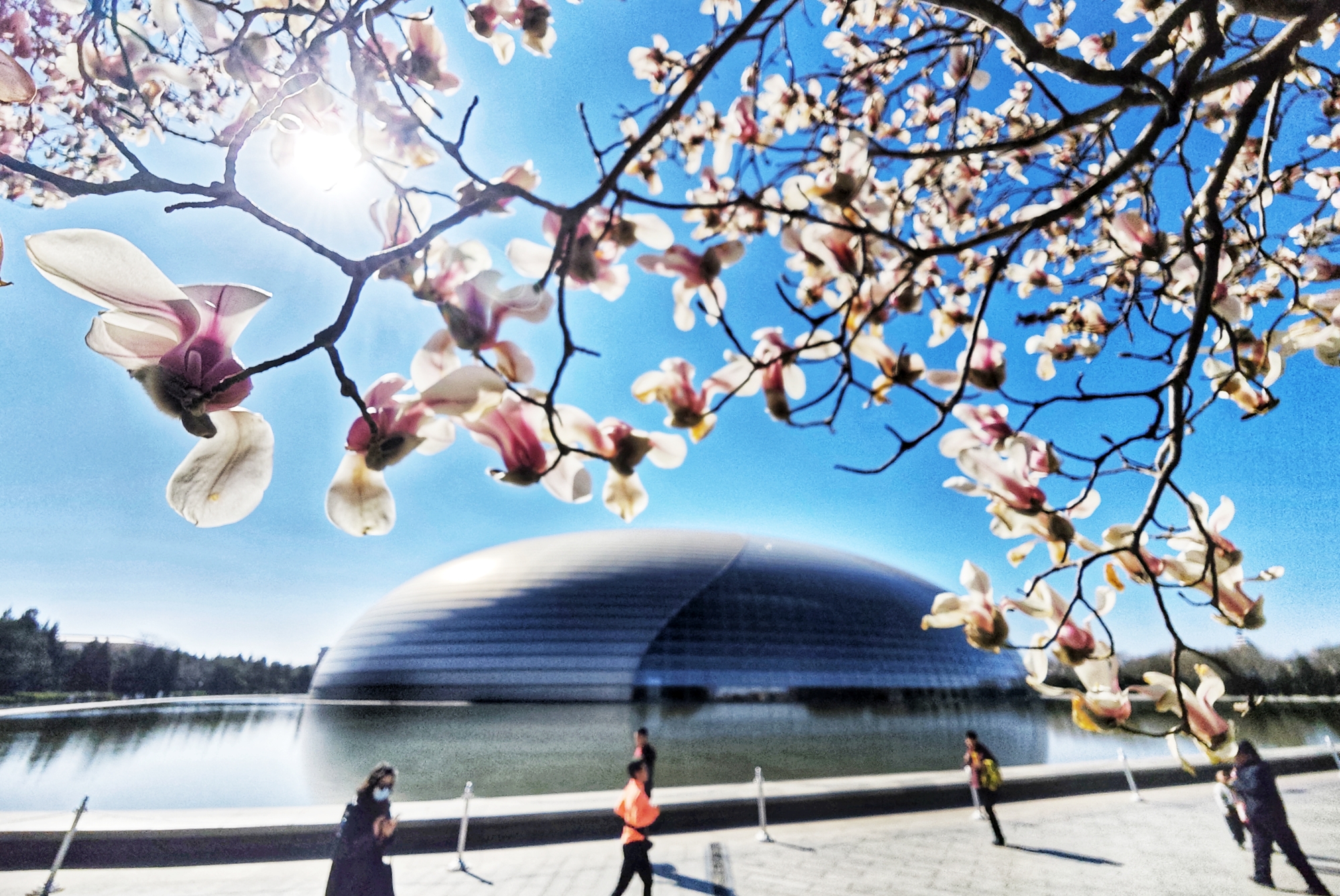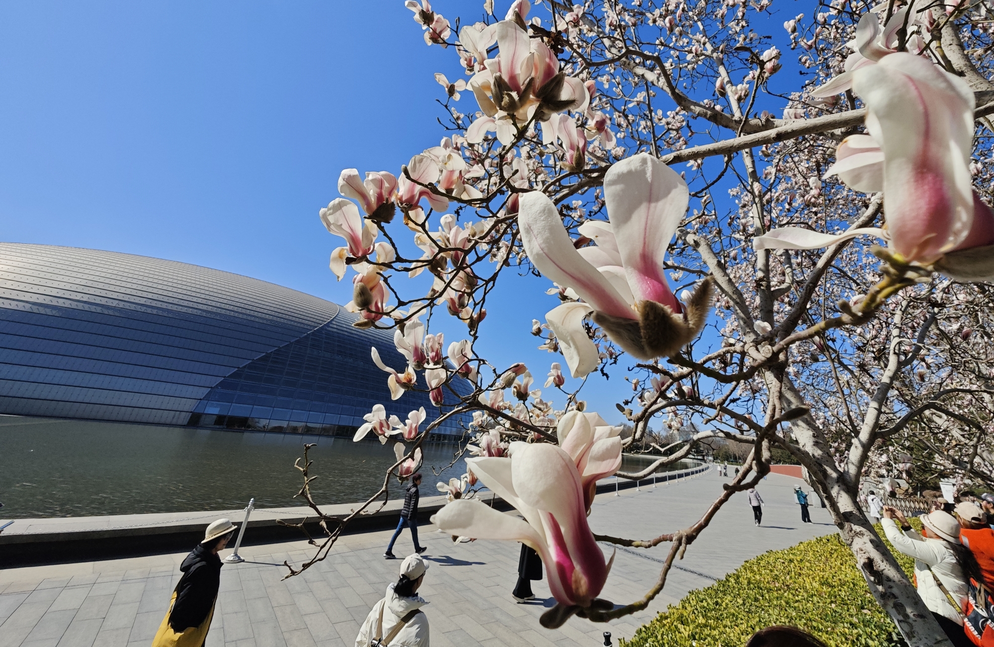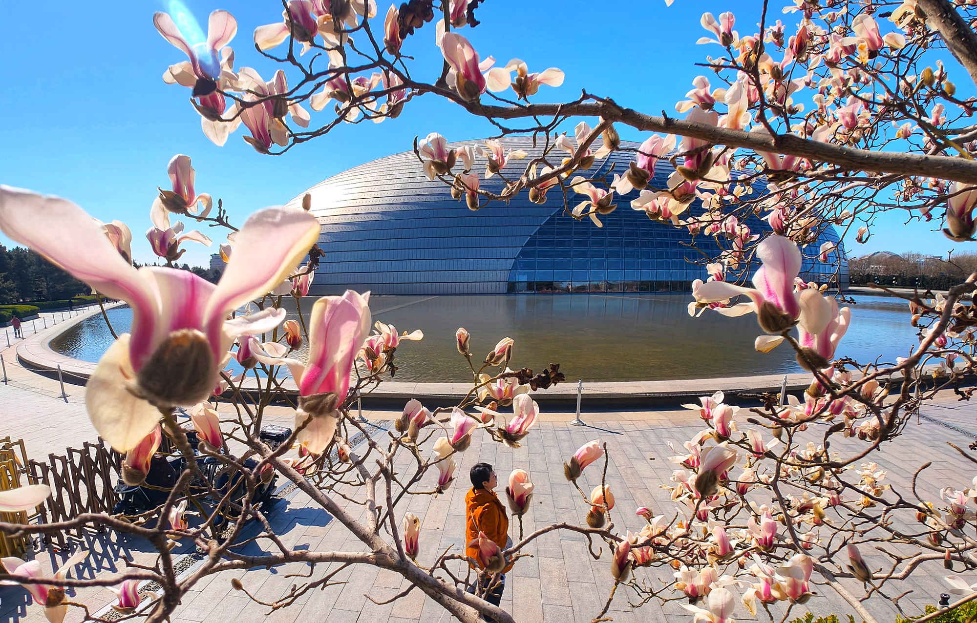 洁白的花朵缀满枝头,与剧院现代感的穹顶、水面交相辉映,勾勒出长安街醉人的春景。