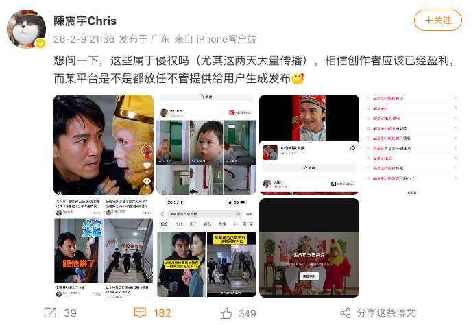 紧随其后,2月9日,周星驰经纪人陈震宇在微博上发文质疑:“想问一下,这些属于侵权吗(尤其这两天大量传播),相信创作者应该已经盈利,而某平台是不是都放任不管提供给用户生成发布?”