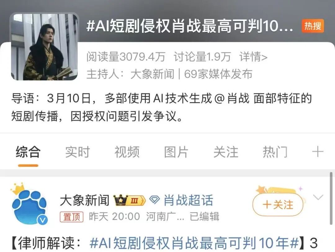 3月10日晚,不少肖战粉丝在短剧平台发现一部名为《京华风云》的AI微短剧,剧中主角相貌与肖战高度相似,服饰也和他在《藏海传》中的造型极为接近。