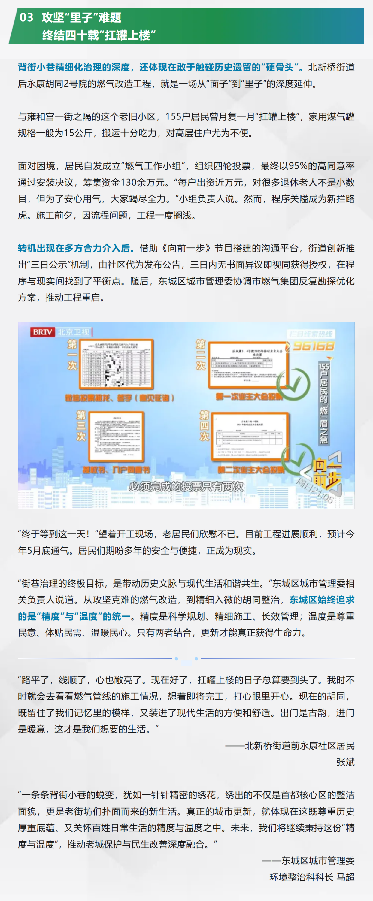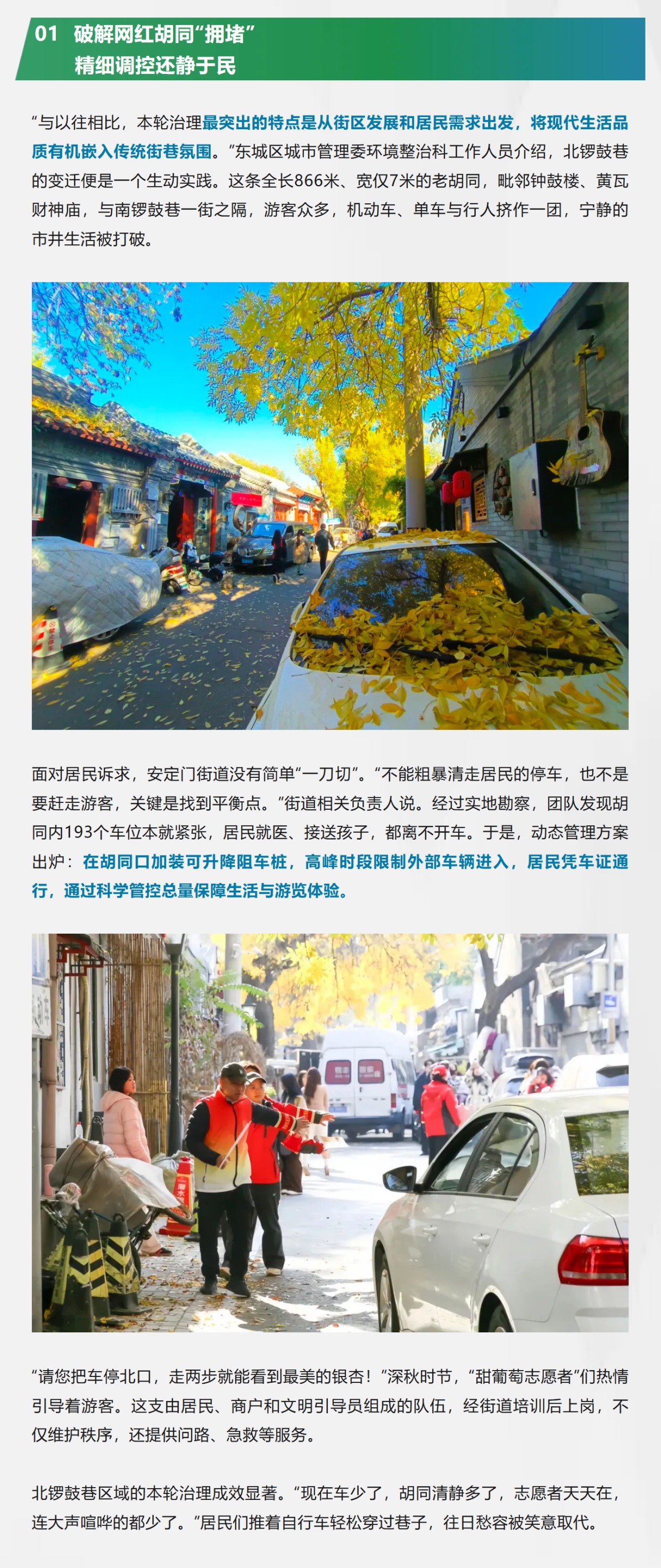 “背街小巷治理就像绣花,一针一线都得精准,更要带着温度。”2025年,东城区通过常态化监管、精细化整治、创新共治共享等系列举措,全年共完成352条背街小巷的精细化治理,整治占道经营190处、清理堆物堆料40.1吨、整修外立面超3.6万平方米,“小巷管家”巡访时长突破10万小时,处理事件1.1万余件,不停车胡同增加到47条。随着背街小巷环境精细化治理三年行动的深入推进,东城区已累计完成982条街巷的治理,推动老城保护与民生改善深度融合,实现从“面子”到“里子”的整体提升,让城市记忆的容器真正成为安放美好生活的港湾。