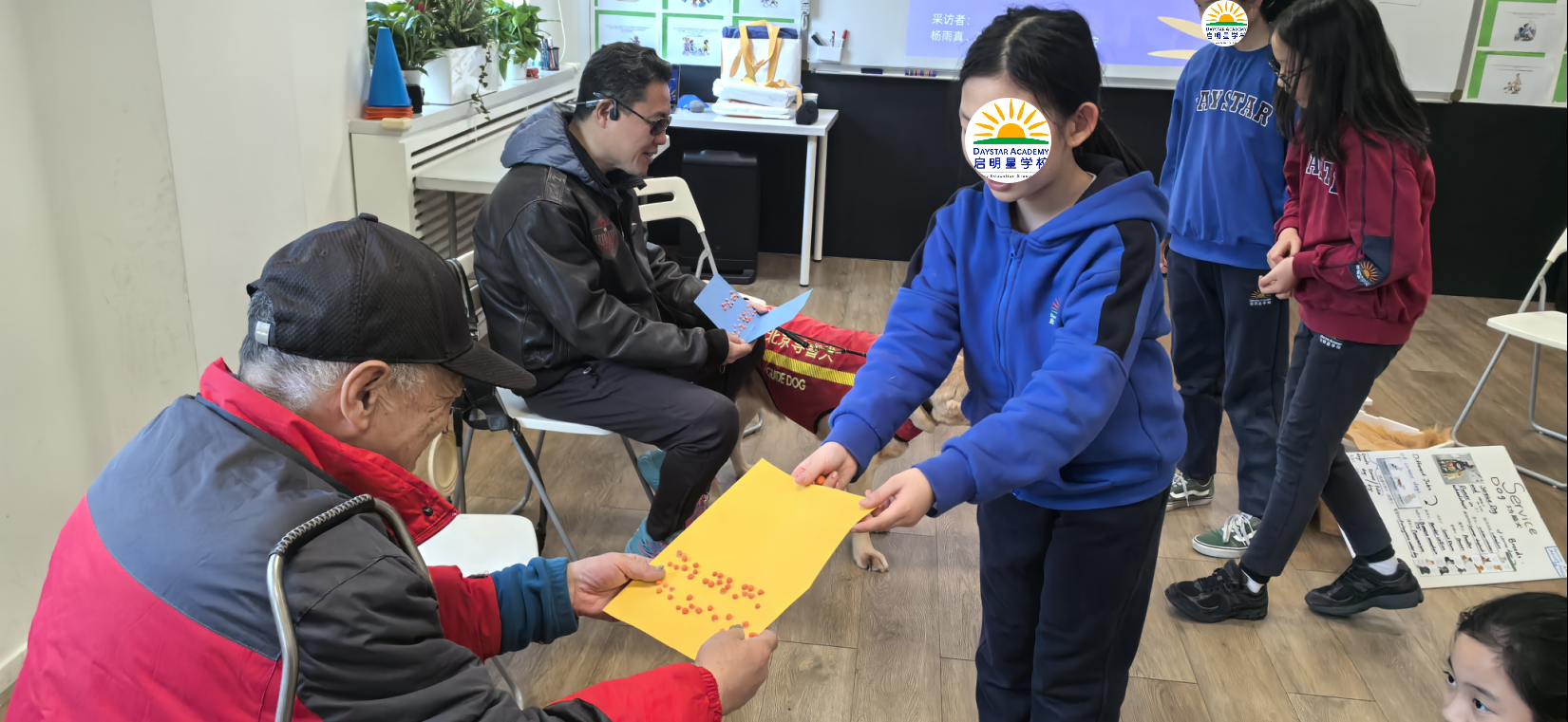 活动伊始,温暖涌动。同学们向使用者赠送了亲手制作的盲文贺卡;向工作人员赠送了自己创作的绘画作品——导盲犬带领视障人士顺畅出行。随后,同学们讲述了自己的选题思路和创作过程,并分享了通过查阅资料了解到的导盲犬品种、“四不一问”等知识。启明星学校三里屯校区的孩子们,正用自己的方式,成为照亮他人的小小星光。
