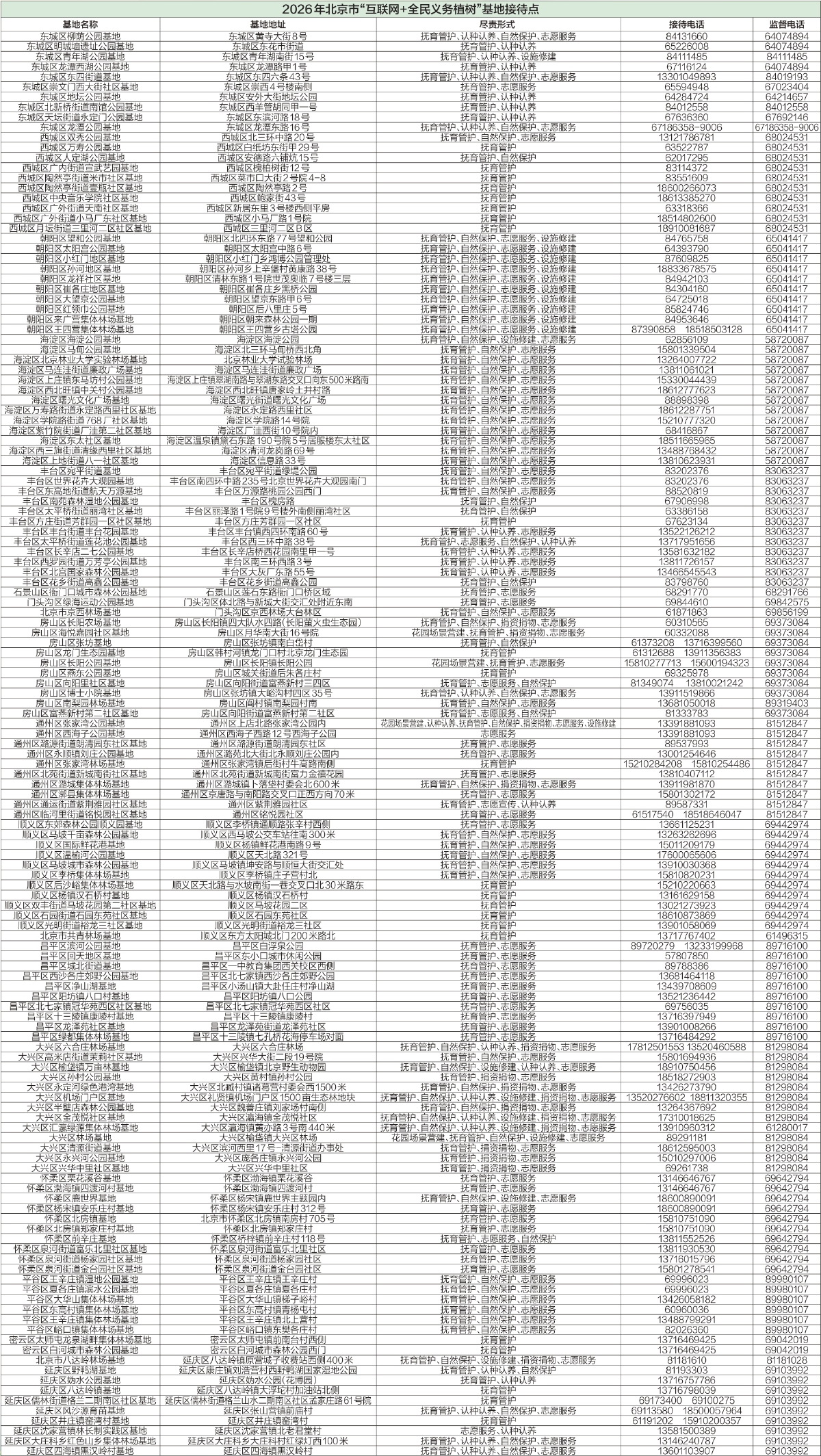 为保障市民便捷参加义务植树,2026年春季,全市共设立植树接待点4处、抚育劳动接待点24处和141个“互联网+全民义务植树”基地。市民可通过电话预约植树和抚育活动;通过“首都全民义务植树”微信公众号,查询“互联网+全民义务植树”基地活动信息,进行预约、签到,活动结束后可在线领取《首都全民义务植树尽责证书》。自行开展阳台绿化等身边尽责活动,且符合《首都全民义务植树尽责形式(2025版)》要求的,可通过公众号“自发尽责”模块,在线申领尽责证书。