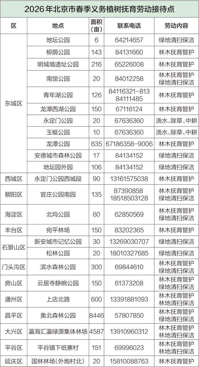 当前,北京正在加快建设花园城市,义务植树是广大市民参与花园城市建设的主要机制和方式。广大市民可依据《首都全民义务植树尽责形式(2025版)》,通过花园场景营建、认种认养、抚育管护、造林绿化、自然保护、设施修建、捐资捐物、志愿服务等8类47种形式,实现全年尽责、多样尽责、方便尽责。首都绿化委员会办公室倡议广大市民参加“身边植绿尽责行动”,积极开展阳台、庭院、屋顶绿化,主动参与社区、村庄、单位绿化美化,以实际行动履行植树义务,携手共建花园城市。