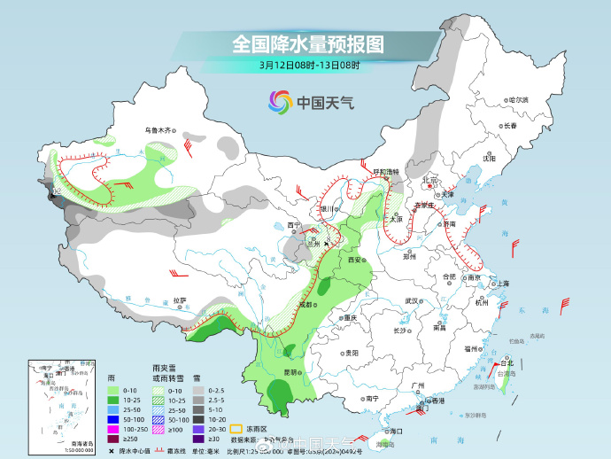 今起四天(3月12日至15日),较强冷空气继续向东推进,雨雪也会随之发展,明后天将为此轮过程最强降雪时段,青海、甘肃、陕西、山西等地部分地区有大到暴雪。其中明天,黑龙江西北部、青海东部、甘肃东南部、宁夏中南部、陕西西北部、川西高原北部等地部分地区有大雪,局地暴雪。