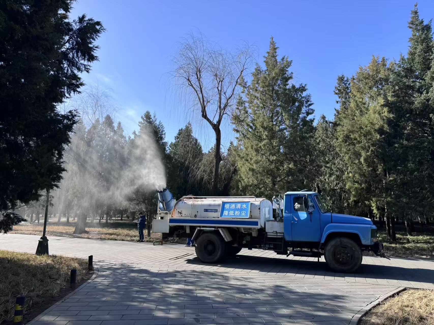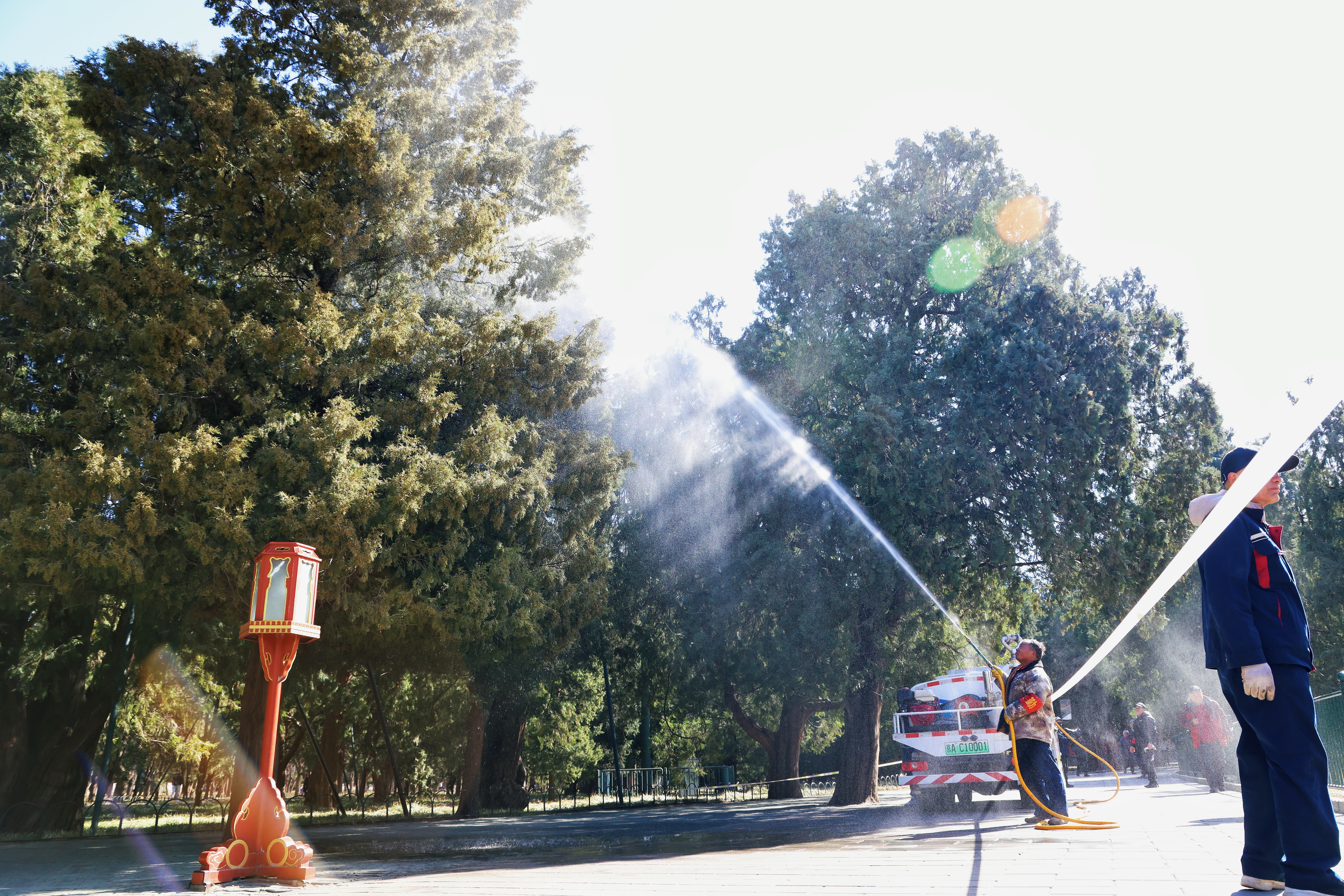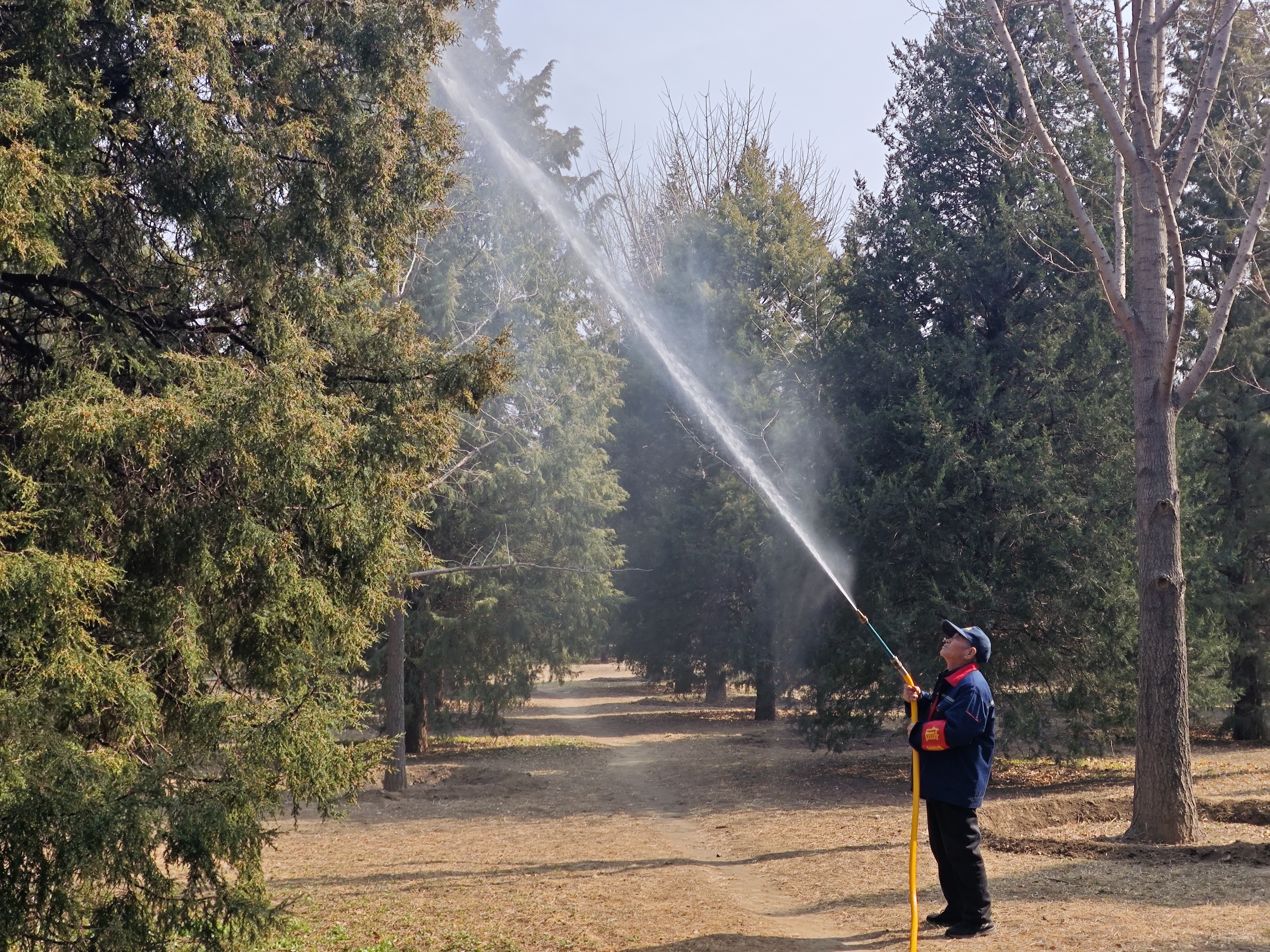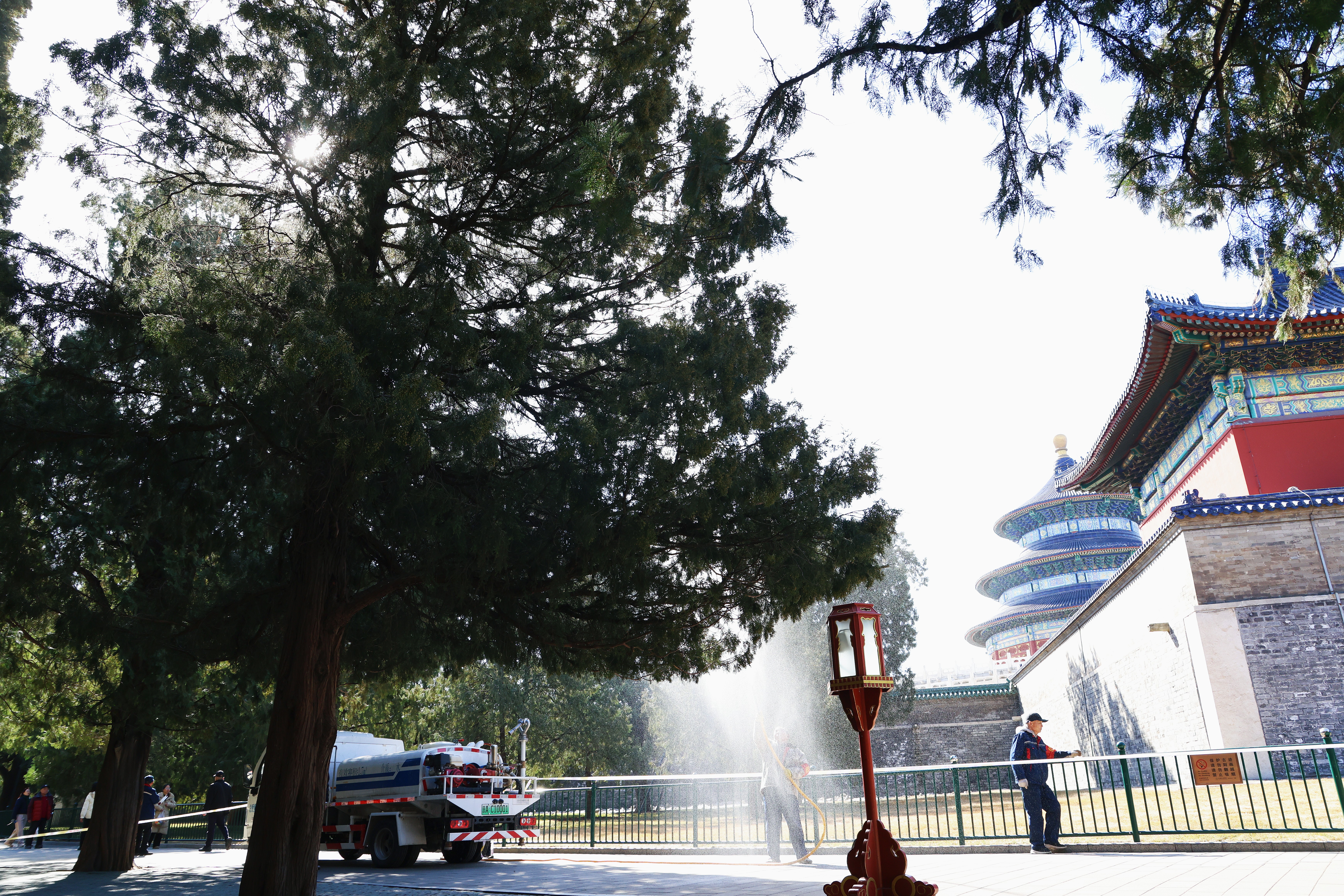 “首先,我们实行错峰精细化作业,动态抑制花粉飘散。”天坛公园相关负责人介绍,在游客量较少、花粉浓度较高的时段,公园组织绿化队与保洁人员对主干道两侧柏树开展高压清水喷淋,及时冲刷花枝花粉,此外,每日开园前、闭园后,强化地面清扫与湿化作业。同时,充分启用草坪微喷系统提升空气湿度,抑制花粉悬浮扩散。