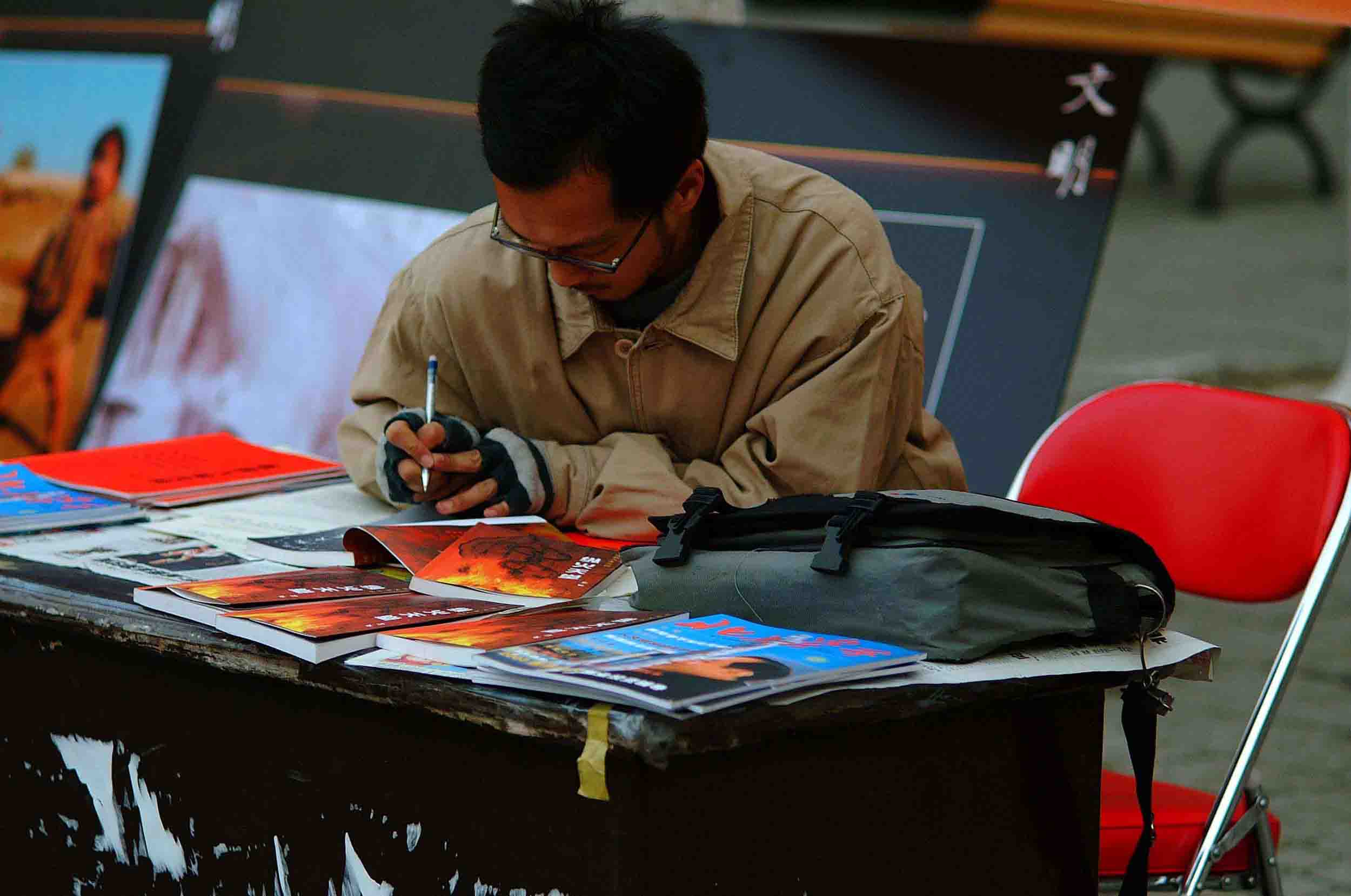 那几年,每天下午,在北大未名湖南岸的一个长椅上,过往的师生都会注意到一个瘦弱的男子和他身旁放着的几本书。书的上方有一块牌子,上面写着“自由作家签名售书”。