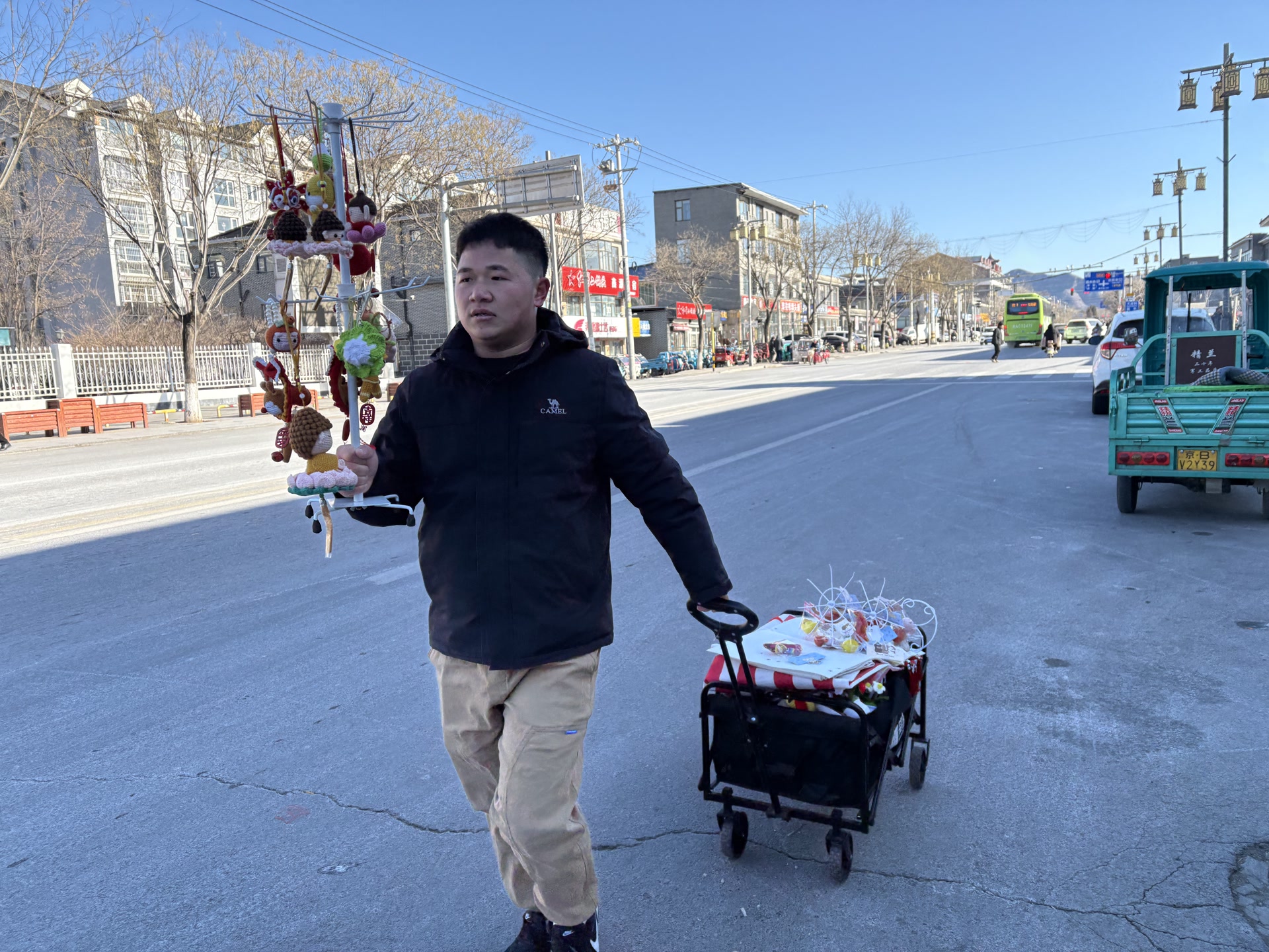在热闹的延庆永宁大集里,一个贩售钩织作品的小摊格外显眼。摊位上,毛茸茸的醒狮帽“瞪着”圆圆的大眼睛,红彤彤的新婚团扇洋溢着喜气,红梅摆件花蕊分明栩栩如生……一件件钩织作品摆放得整整齐齐,引来不少赶集人驻足端详。