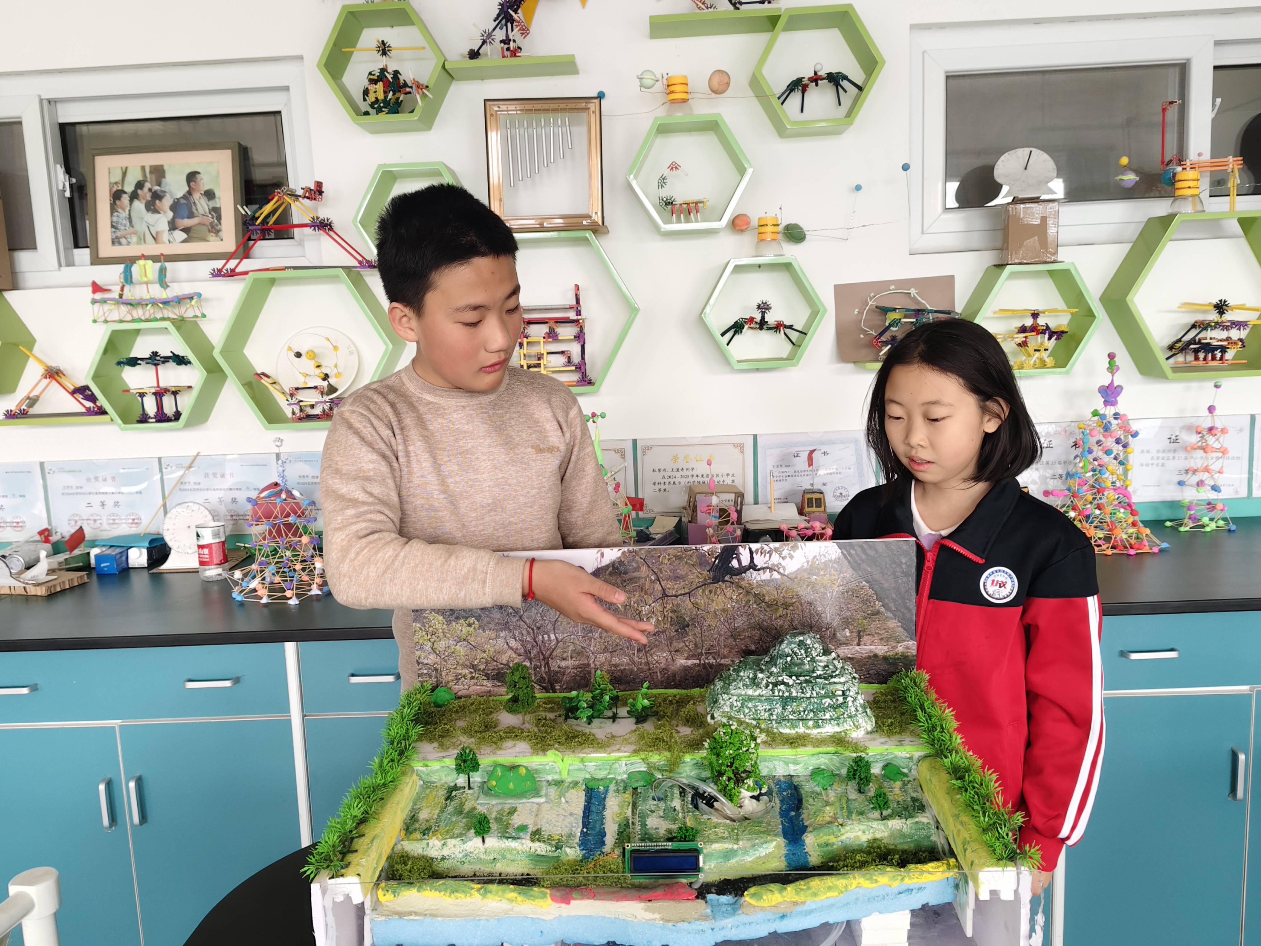 “大城子镇是密云红梨的主产区,我和小伙伴实地考察了学校附近张庄子村的果园,发现果农需要扛着水管上山、接自来水给梨树浇水。这种灌溉方式非常浪费。”实验室里,大城子学校六年级学生穆雨馨站在一个山地沙盘模型旁,向同学们分享自己的创意初衷,她说,“无电力供应、劳动力短缺、灌溉时机难把握等问题一直困扰着当地果农。我们希望运用科技的力量帮助他们解决实际问题。”