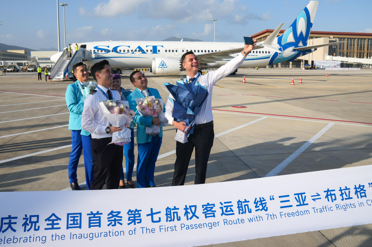 2025年12月22日,全国首批第七航权航班旅客从捷克布拉格飞抵海南三亚,机组人员在三亚凤凰国际机场停机坪与客机合影留念。海南日报全媒体记者 王程龙 摄