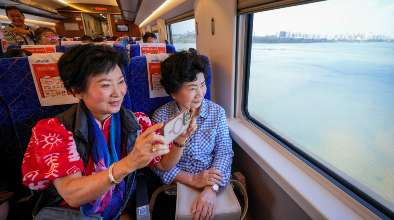 1月30日,来自泰国的游客乘坐环岛高铁游览美景。海南日报全媒体记者 张茂 实习生 柳一诺 摄