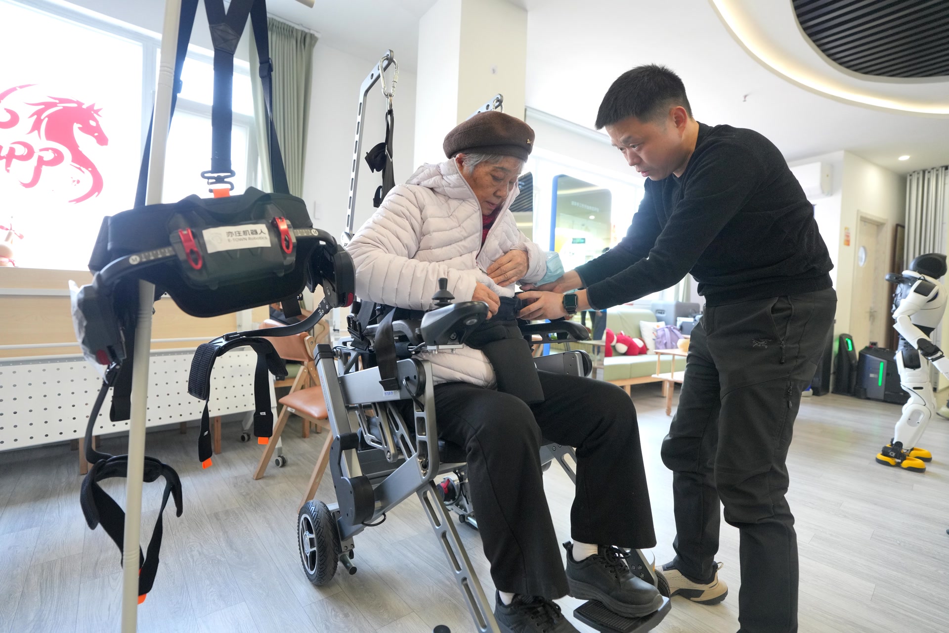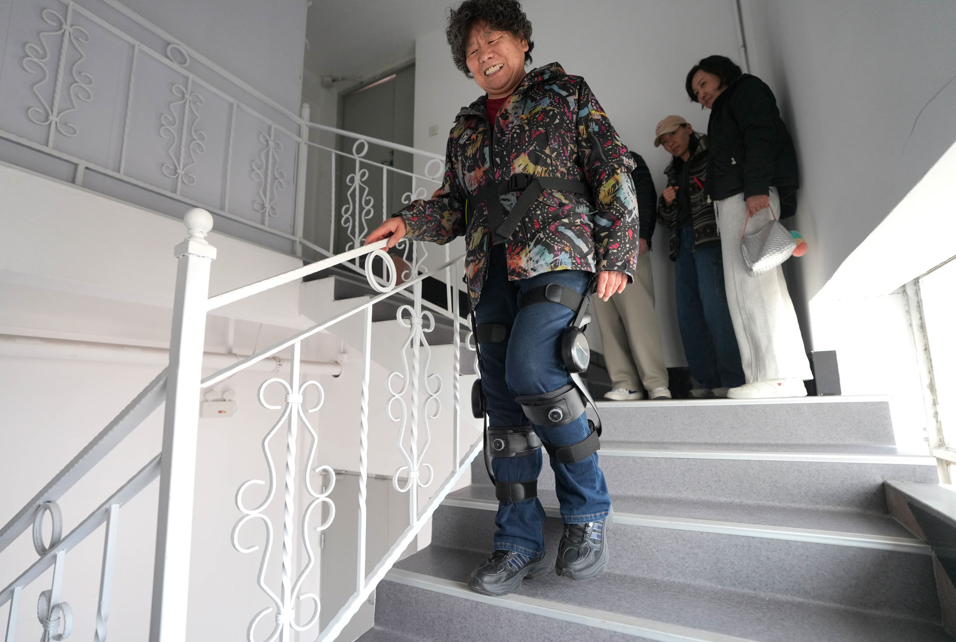 对于今年74岁的王阿姨来说,最想体验的是康复理疗区。平时,她上下楼很费力,得牢牢抓着扶手一级一级慢慢动。驿站里的工作人员一分钟就给她穿戴好了外骨骼机器人。这下她再爬楼,感觉大腿和小腿仿佛有人托着一样,膝盖不疼了,自己也没使大劲儿。