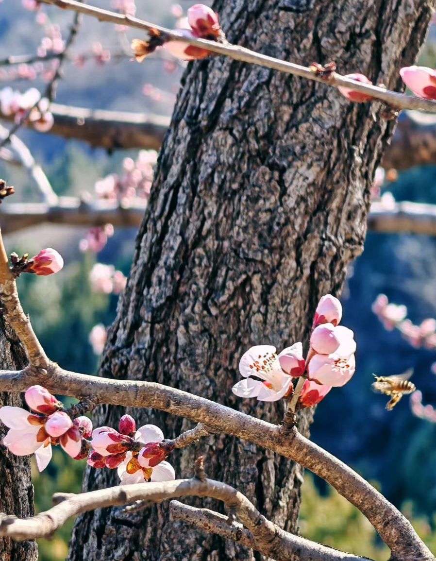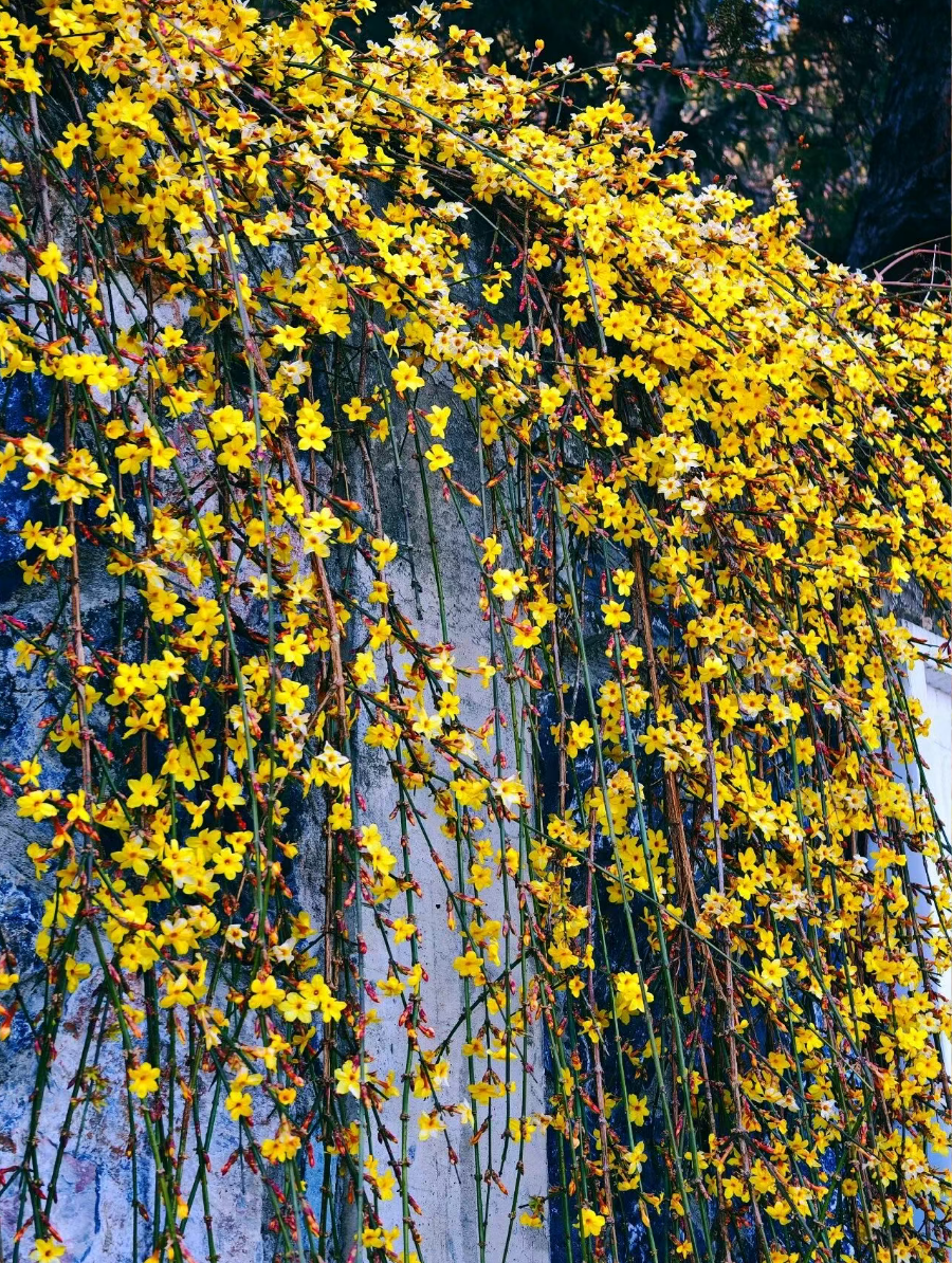 嫩黄的迎春花、粉粉的山桃花挂满枝头,