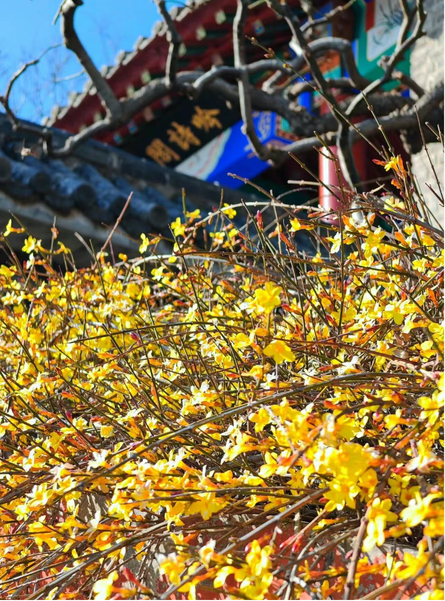 2. 拍摄建议:拍摄山桃可利用蓝天作背景,突出色彩对比;拍摄迎春花可结合石墙的肌理,体现春日的刚柔并济。