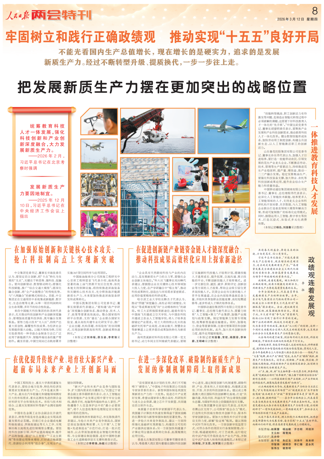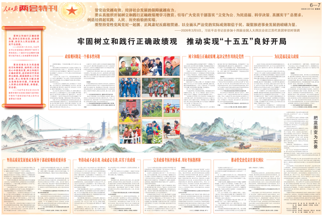 在“十五五”开局起步的关键时间节点,党中央决定在全党开展树立和践行正确政绩观学习教育。今天(3月12日),人民日报两会特刊用6个版聚焦这一件事:牢固树立和践行正确政绩观,推动实现“十五五”良好开局。