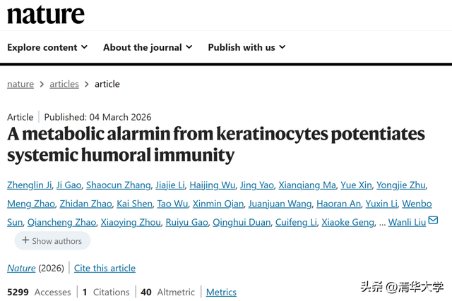 《角质形成细胞的代谢警报素诱导系统性免疫应答》(A metabolic alarmin from keratinocytes potentiates systemic humoral immunity)为题