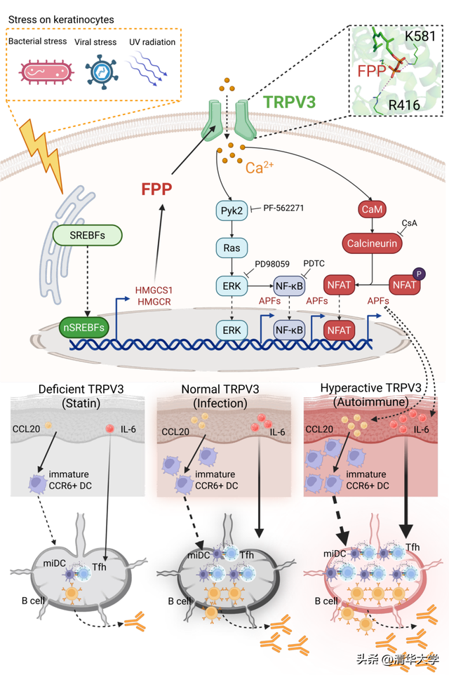 简单来说,当皮肤被病菌感染或被强紫外线照射时,皮肤的角质形成细胞会启动应急反应,让细胞内快速积累FPP。这种物质是细胞发出的“免疫警报素”,它会精准结合细胞上的TRPV3胞内结构域,就像钥匙打开锁一样,让钙离子进入细胞内,进而激活两条信号通路,促使细胞分泌出IL-6和CCL20两种关键物质。