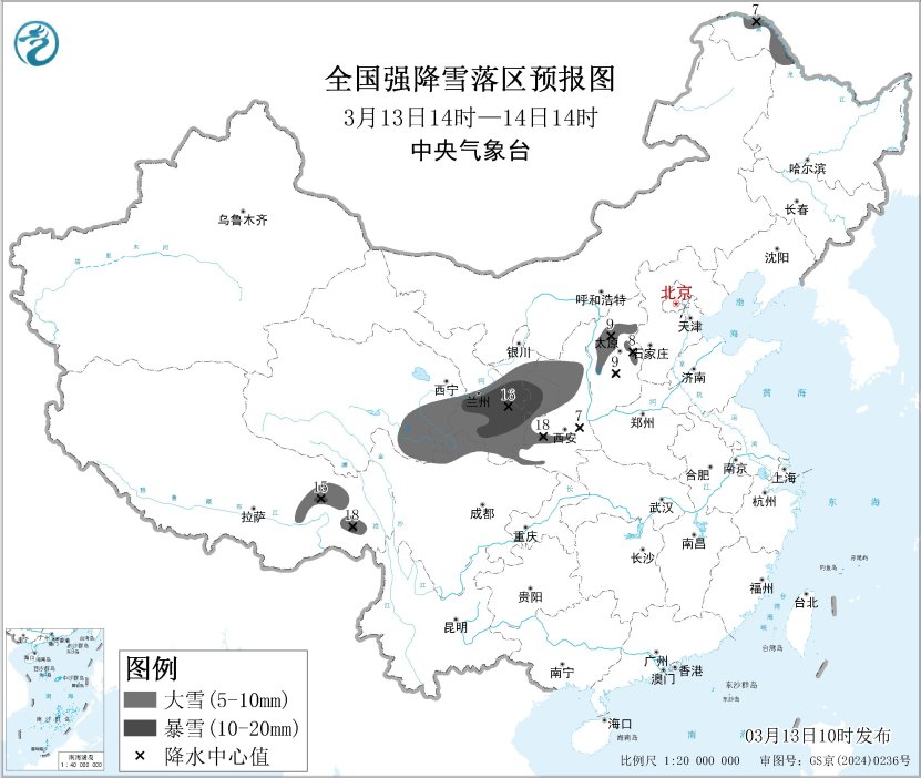 预计3月13日14时至3月14日14时,甘肃东部和南部、宁夏南部、陕西北部和秦巴山区、山西中北部以及川西高原北部、西藏东部、青海东部、黑龙江西北部等地有大雪,其中,甘肃东部、宁夏南部、秦岭西部、西藏东部等地部分地区有暴雪(10~18毫米)。上述部分地区新增积雪深度5~10厘米,局地可达15厘米以上。
