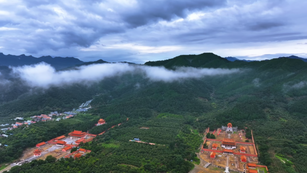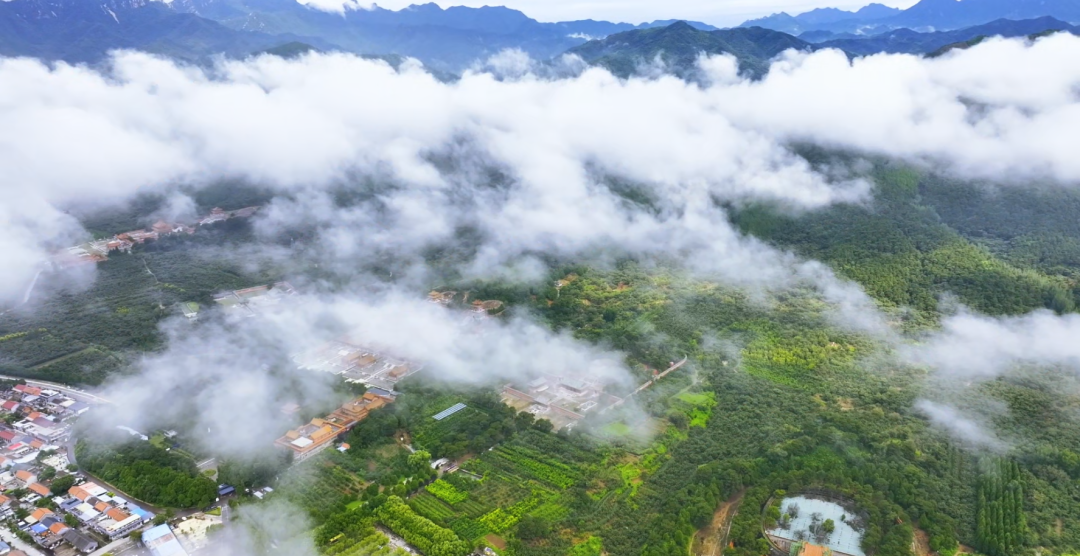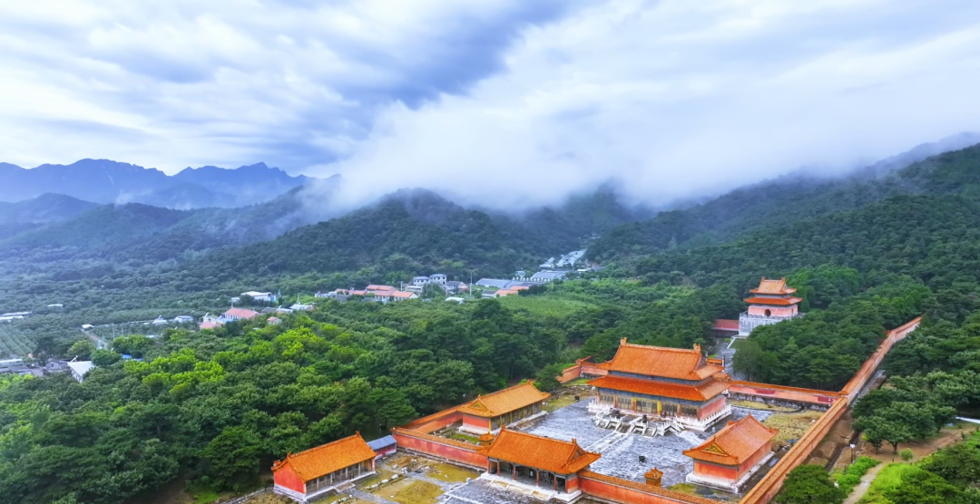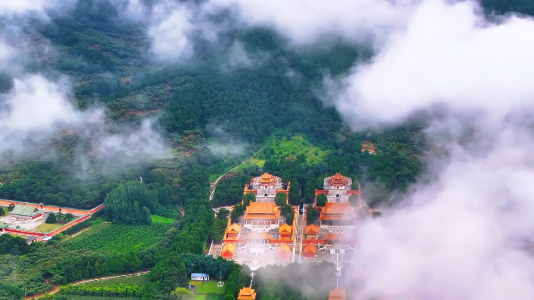 云雾是时光的纱,轻轻一掀,便窥见清东陵的全貌。从高空俯瞰,五座帝陵、四座后陵依着山势错落排布,金黄的琉璃瓦在苍翠林海间熠熠生辉,朱红的宫墙勾勒出皇家陵寝独有的规整与威仪。风过松涛,沙沙作响,仿佛是百年前的宫阙回响;云卷云舒,漫过殿宇屋脊,将康乾盛世的荣光、晚清变局的沧桑,都晕染成朦胧的诗意。
