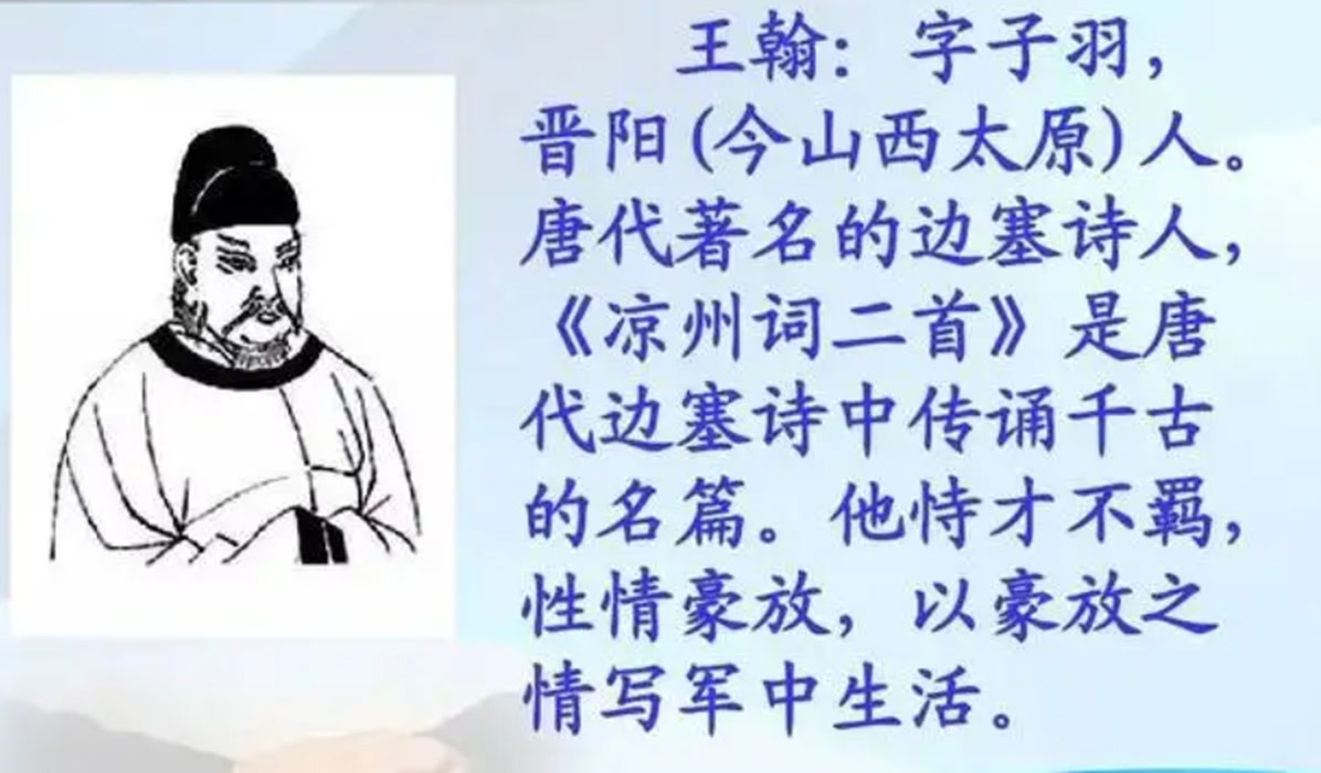 王翰,字子羽(约687-约726年),并州晋阳(今山西太原)人,盛唐诗人。王翰年轻时豪爽不羁。景云元年(710年),王翰进士及第。后受到举荐入京,先后任秘书正字、通事舍人、驾部员外郎等职。随着举荐人张说倒台,他被贬后行踪不明。
