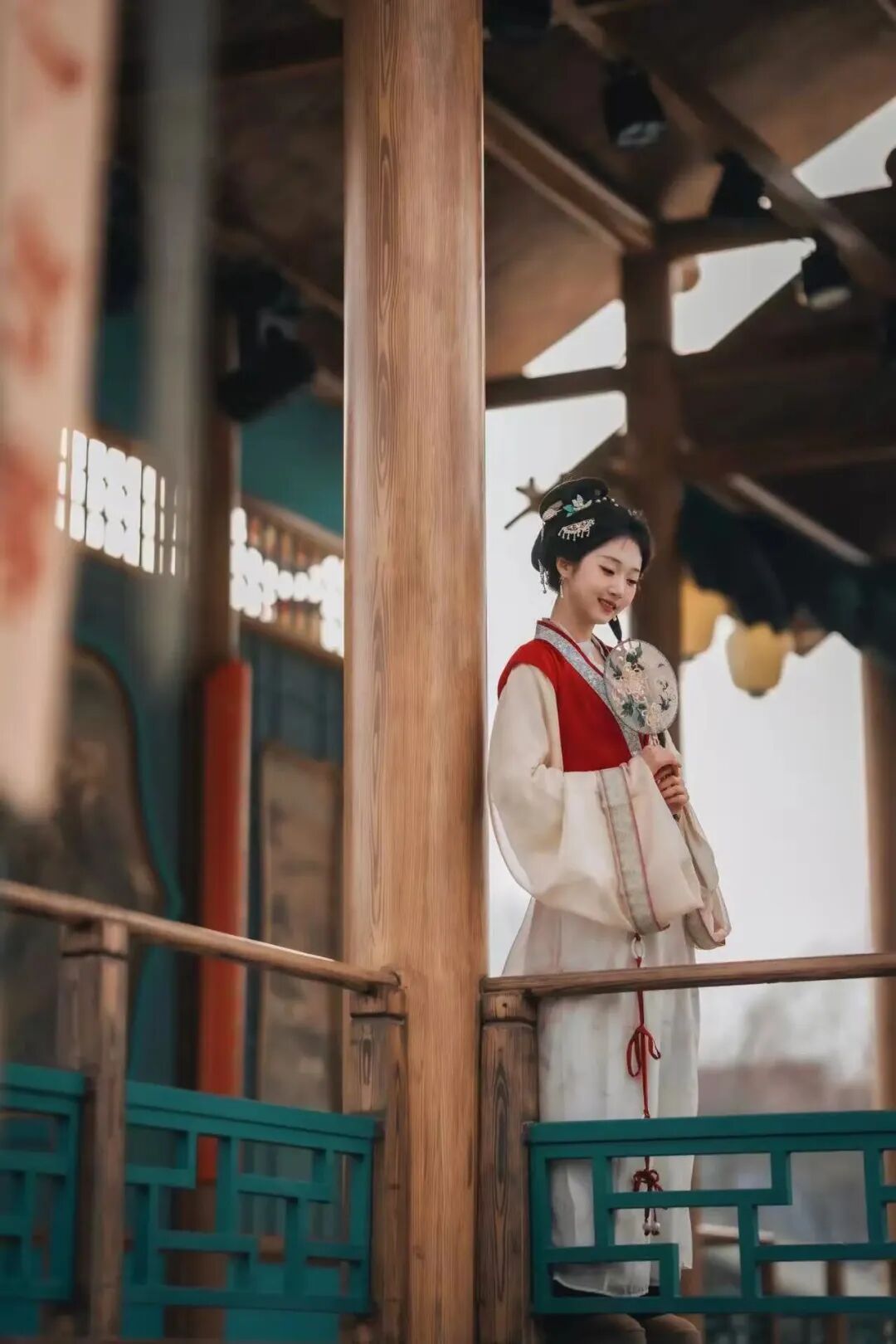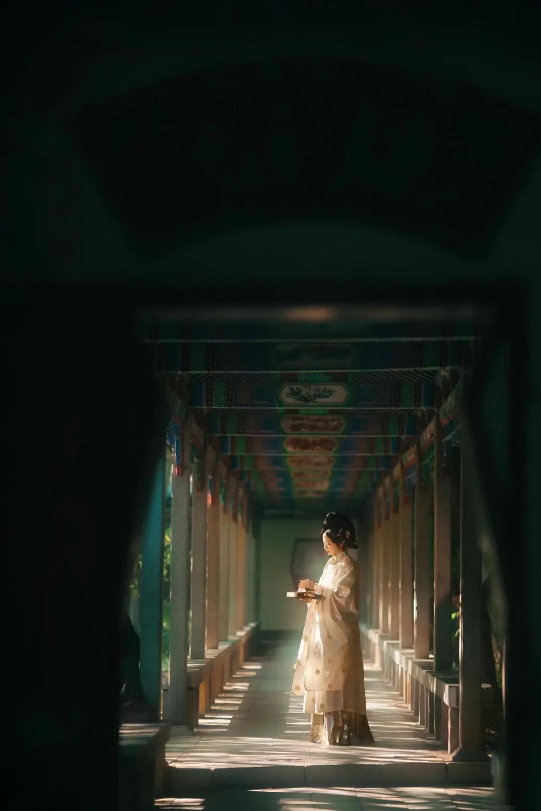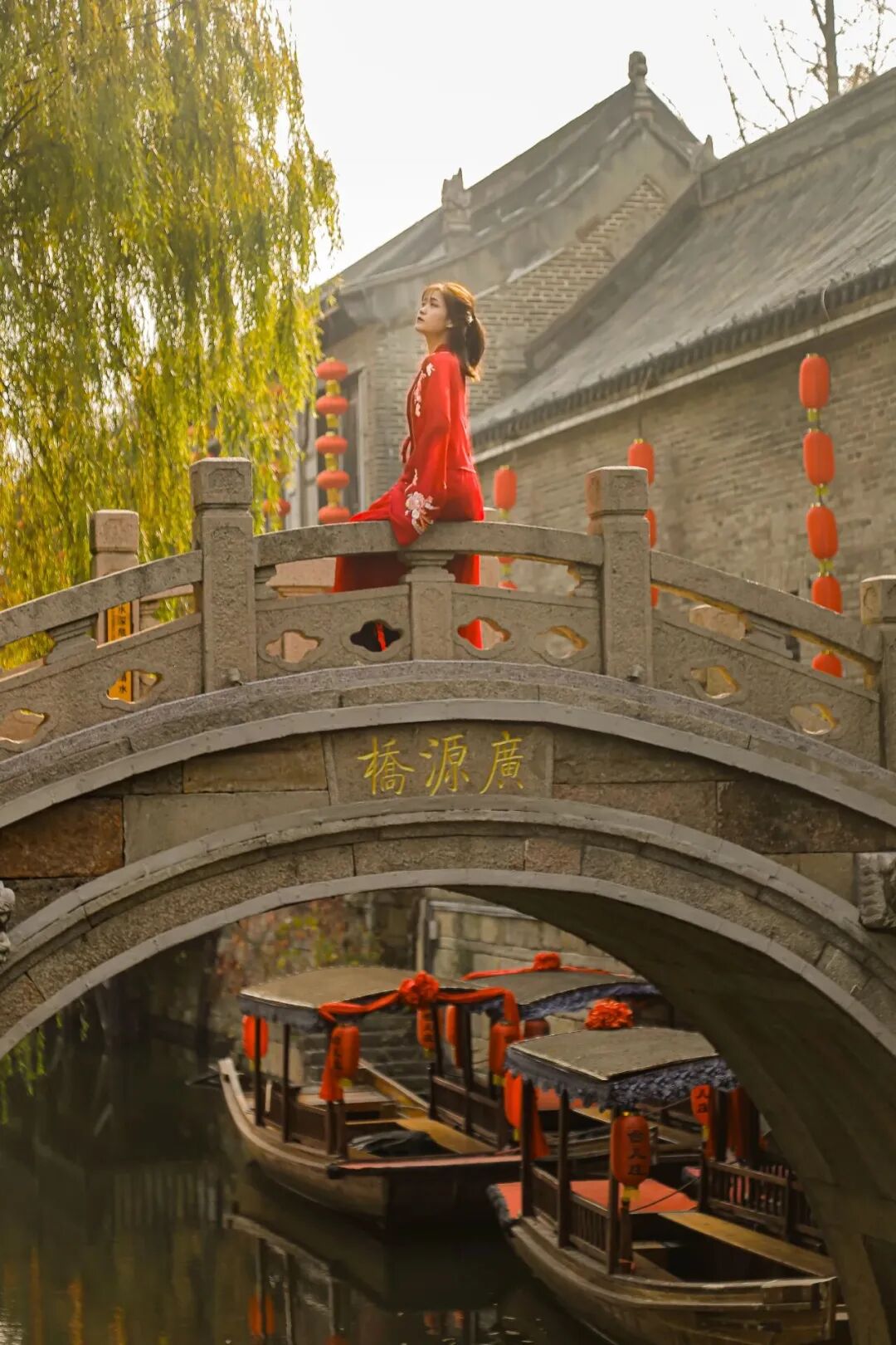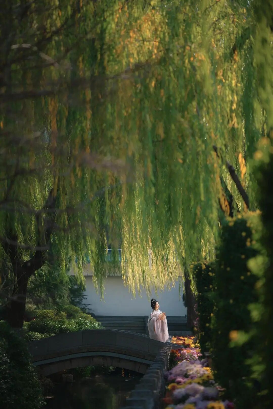 阳光慢慢洒下来时,站在石桥上逆光拍摄,发丝镶着金边,身后是泉水、亭台、飞檐,不用修图就已经美得不像话。
