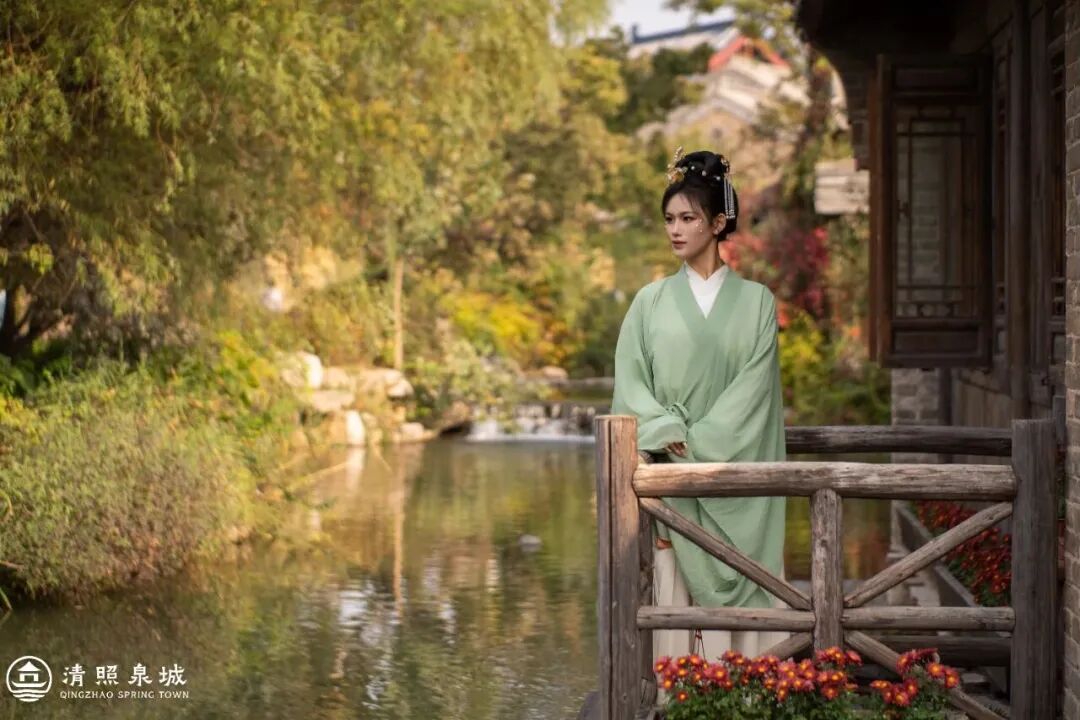 清晨的明水古城最是温柔。薄雾还没散去,泉水冒着轻烟,青石板路被晨露打湿,换上一身清冷感满满的魏晋风汉服,走在临水的廊桥下,随便一站就是电影感。