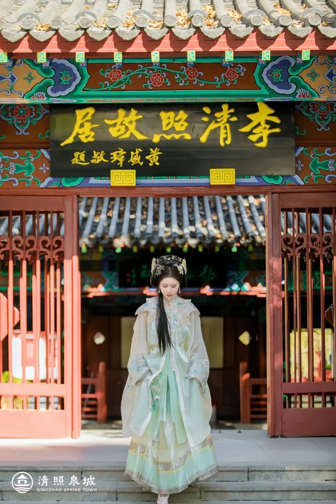李清照纪念堂更是为汉服量身定做。飞檐翘角、红柱回廊、月洞门、竹林、古杏树……每一处都透着文人风雅。穿明制汉服漫步庭院,仿佛一转身,就能遇见那位写尽婉约的才女。