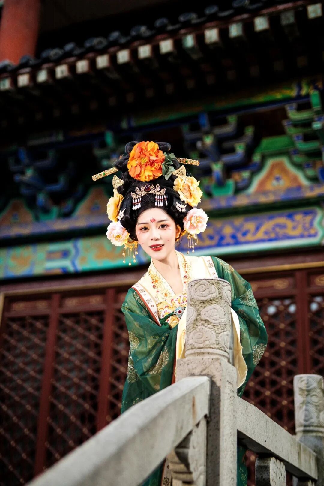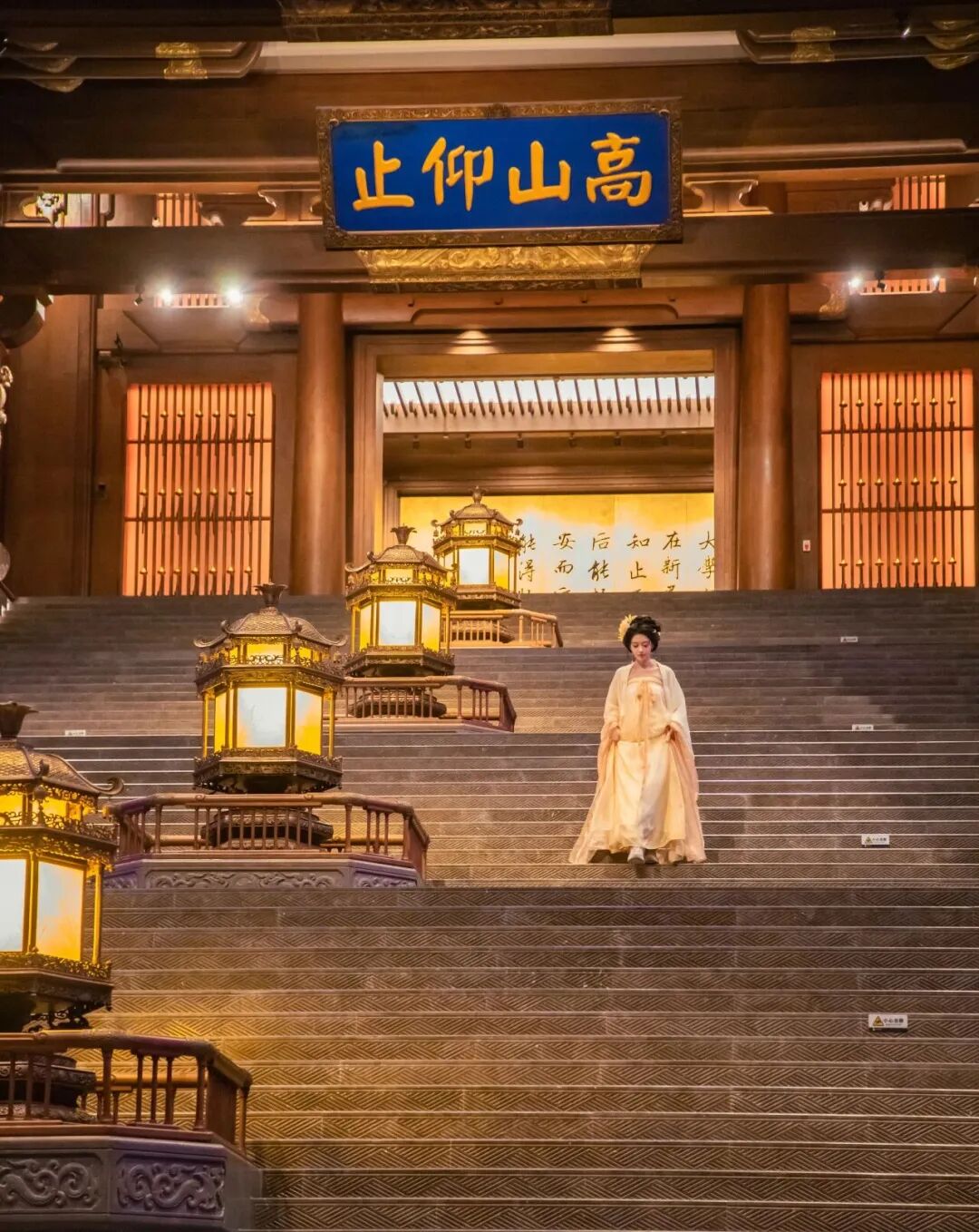 81级大学之道台阶,拾级而上,广角拍摄尽显庄严大气,汉服裙摆与台阶延伸线同框,仪式感拉满;集贤厅的金色穹顶、雕花立柱、琉璃光影,站在厅中随手一拍,就是宫殿级大片;长廊与回廊的木质窗棂、水墨壁画,光影斑驳间,拍侧脸、背影、回眸,温婉又有书卷气。