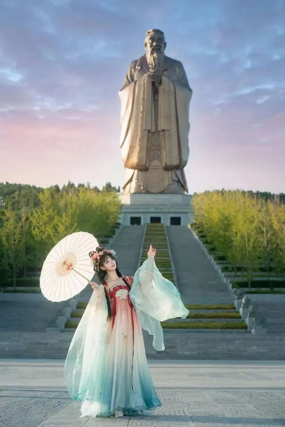 傍晚的孔子像在蓝调时刻更显温润,广角仰拍,人与圣像、粉紫渐变的天空同框,庄重又治愈。