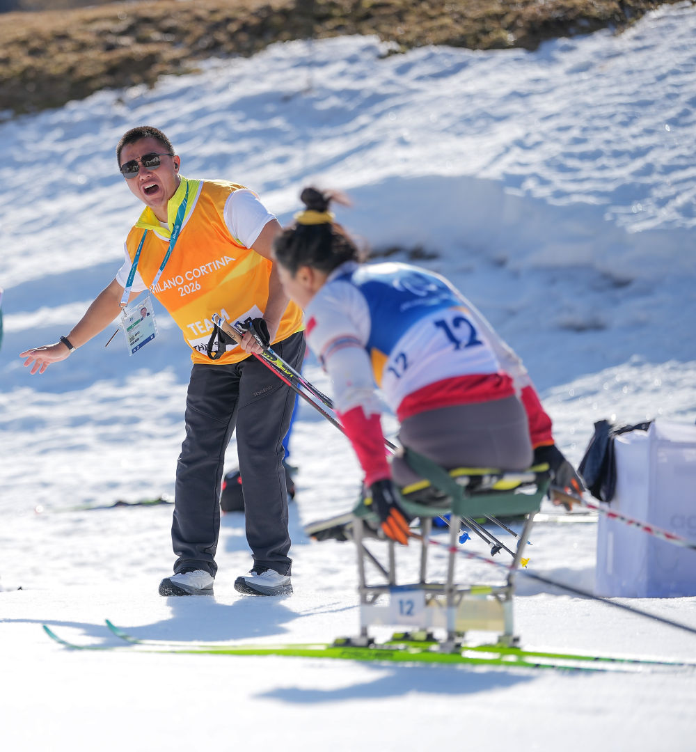3月8日,在泰塞罗越野滑雪中心,中国国家冬残奥越野滑雪和冬季两项队副领队杨明(左)在米兰-科尔蒂纳冬残奥会残奥冬季两项女子中距离(坐姿)比赛中鼓励队员王诗瑀。新华社记者 侯昭康 摄