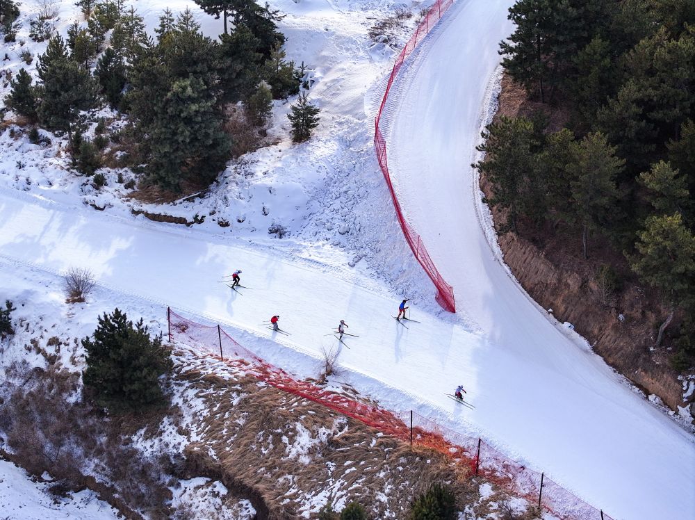 2月3日,中国运动员在岱海国际滑雪场训练(无人机照片)。 新华社记者 连振 摄