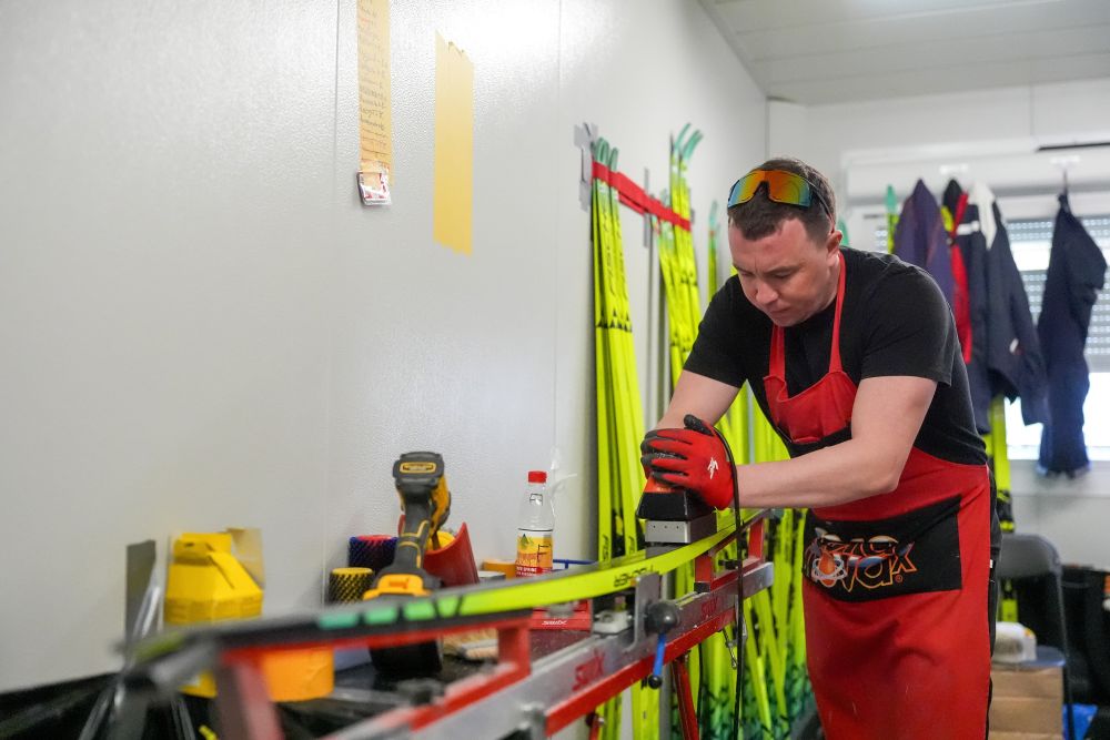 3月6日,在泰塞罗越野滑雪中心,中国队助理教练兼打蜡师谢尔盖·萨莫伊洛夫给中国残奥运动员的雪板打蜡。新华社记者 连振 摄
