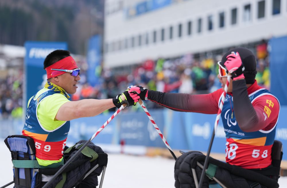 当地时间3月11日,米兰-科尔蒂纳冬残奥会越野滑雪男子中距离(坐姿)比赛在意大利泰塞罗举行。 毛忠武、郑鹏分获亚军、季军。这是毛忠武(左)和郑鹏在冲过终点后庆祝。 新华社记者 连振 摄