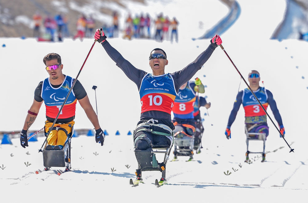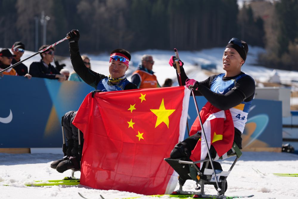 当地时间3月10日,在意大利泰塞罗举行的米兰-科尔蒂纳冬残奥会越野滑雪男子短距离(坐姿)比赛中,中国选手刘子旭夺冠。 这是刘子旭(前)在赛后庆祝夺冠。 新华社记者 侯昭康 摄