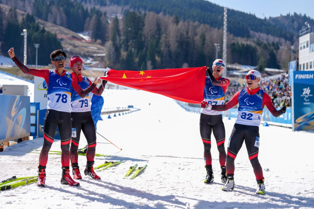 当地时间3月8日,在意大利泰塞罗举行的米兰-科尔蒂纳冬残奥会冬季两项男子中距离(站姿)比赛中,中国选手蔡佳云夺得冠军。这是中国选手蔡佳云(右一)、刘晓彬(右二)、袁明寿(右三)和吴君宝在比赛后庆祝。 新华社记者 连振 摄