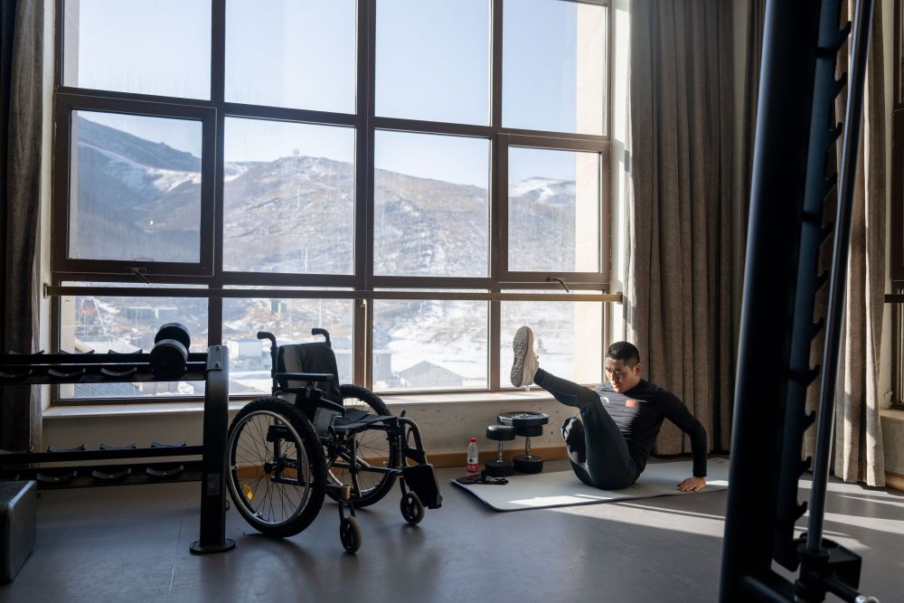 2月3日,中国残奥运动员王涛在岱海国际滑雪场上进行室内体能训练。 新华社记者 连振 摄