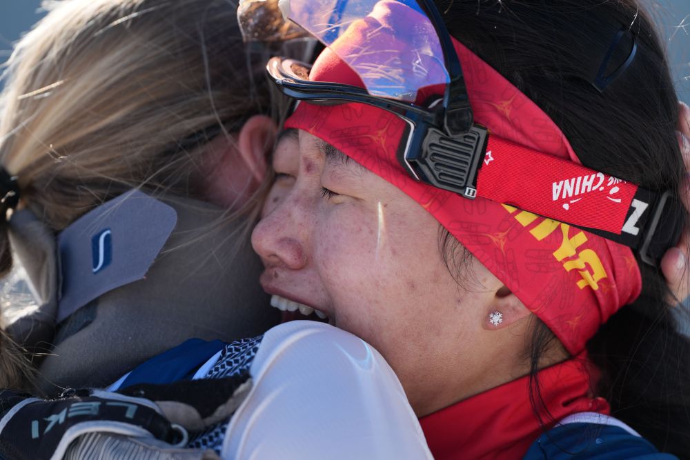 当地时间3月7日,在意大利泰塞罗举行的米兰-科尔蒂纳冬残奥会冬季两项女子短距离(视障)比赛中,中国选手王跃获得冠军。 这是王跃(右)赛后与对手拥抱庆祝夺冠。新华社记者 侯昭康 摄