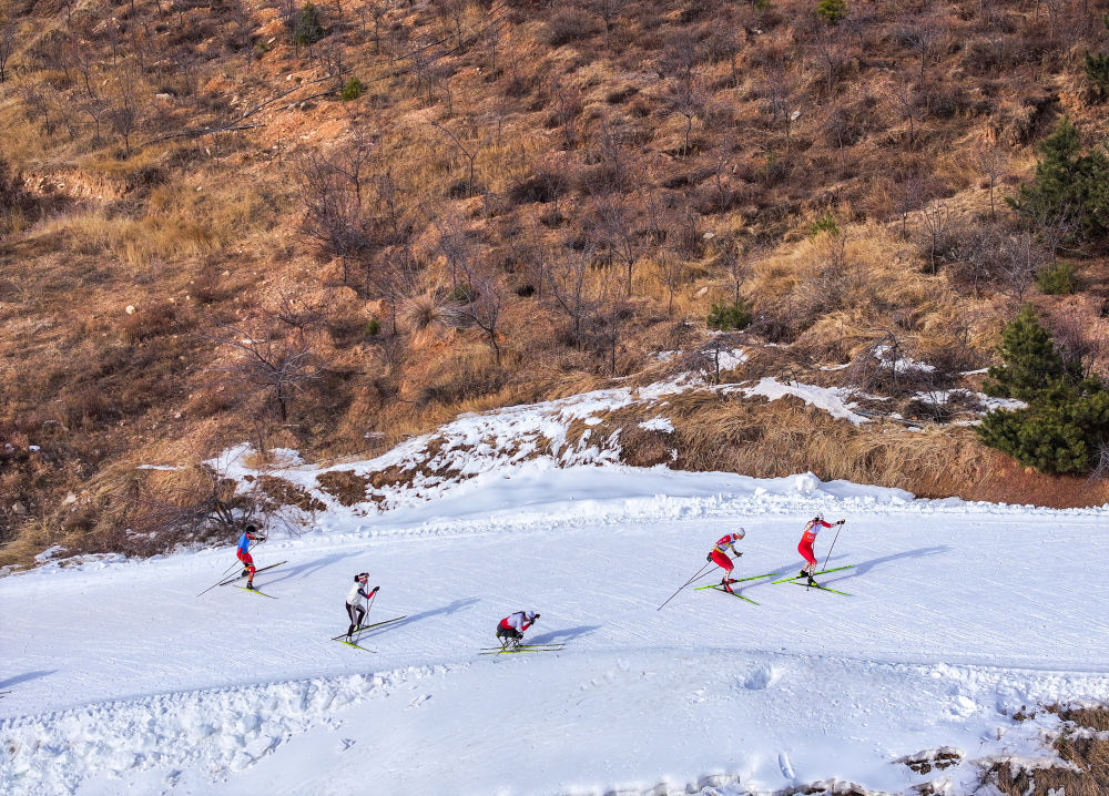 2月3日,中国运动员在岱海国际滑雪场训练(无人机照片)。新华社记者 连振 摄