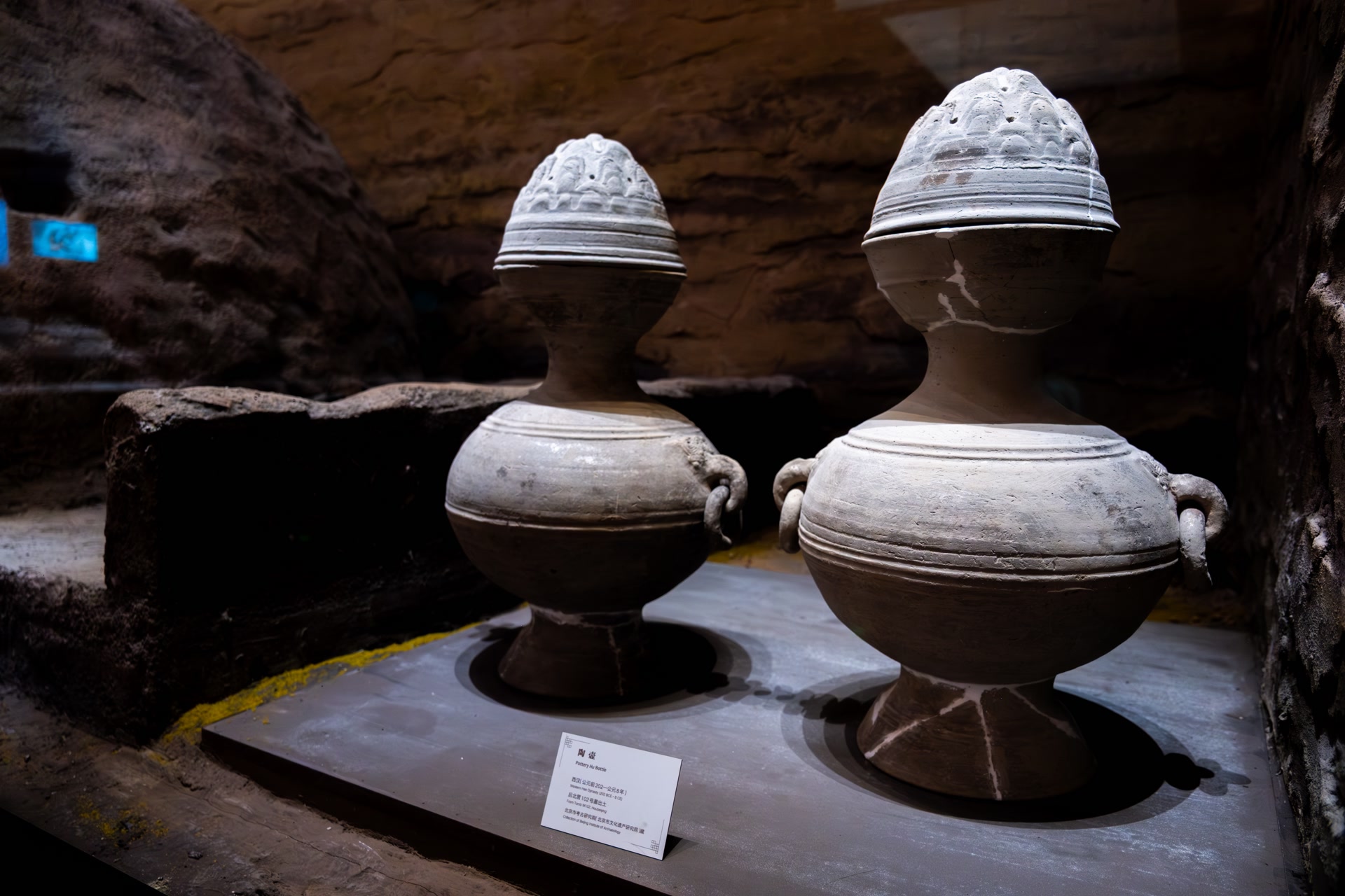 路县故城遗址出土博山形陶器数量众多,展览展出的是西汉时期的1对博山形盖陶壶和1个博山形盖陶罐。