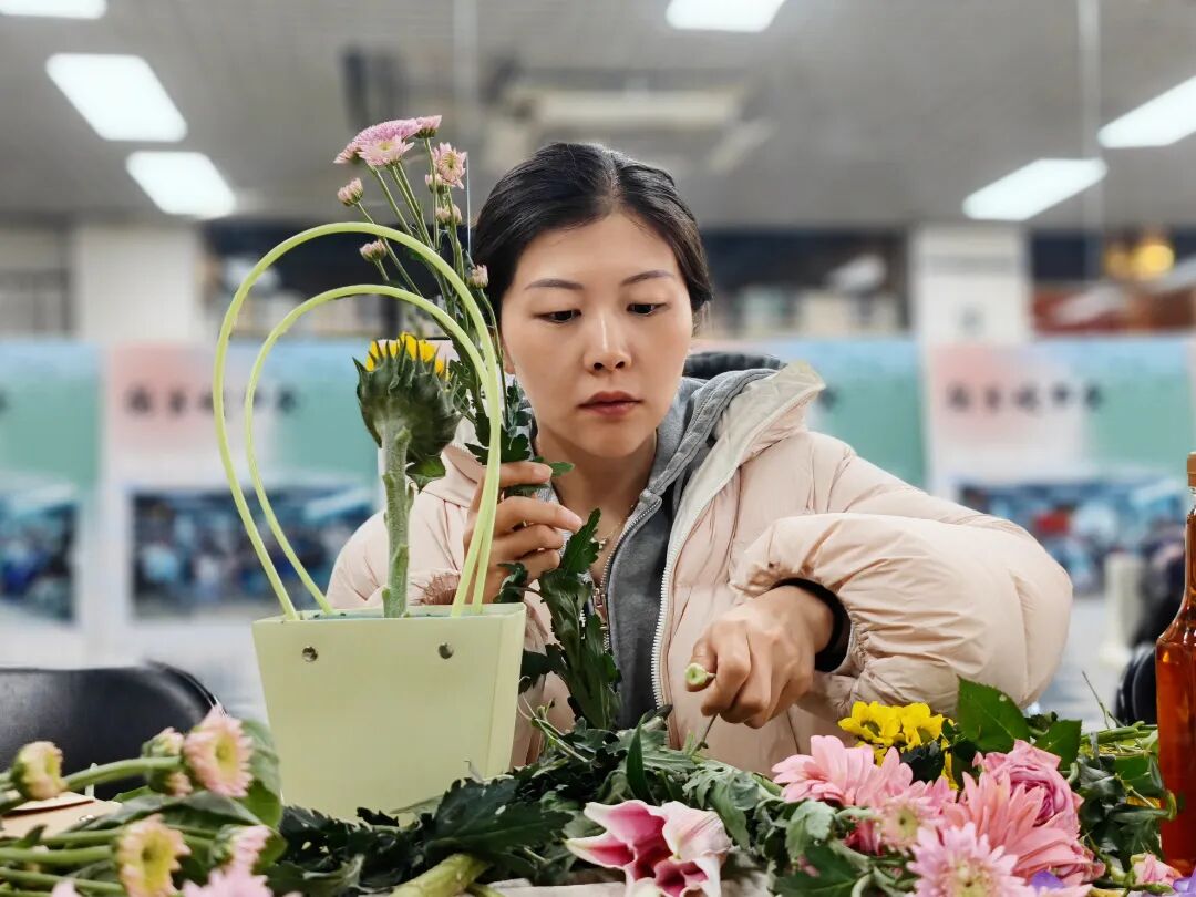 活动现场,花艺老师以生动通俗的讲解,为大家介绍花材名称、花语寓意与日常养护技巧,细致拆解插花配色、层次构图等美学要点,让零基础参与者快速上手、学有所获。