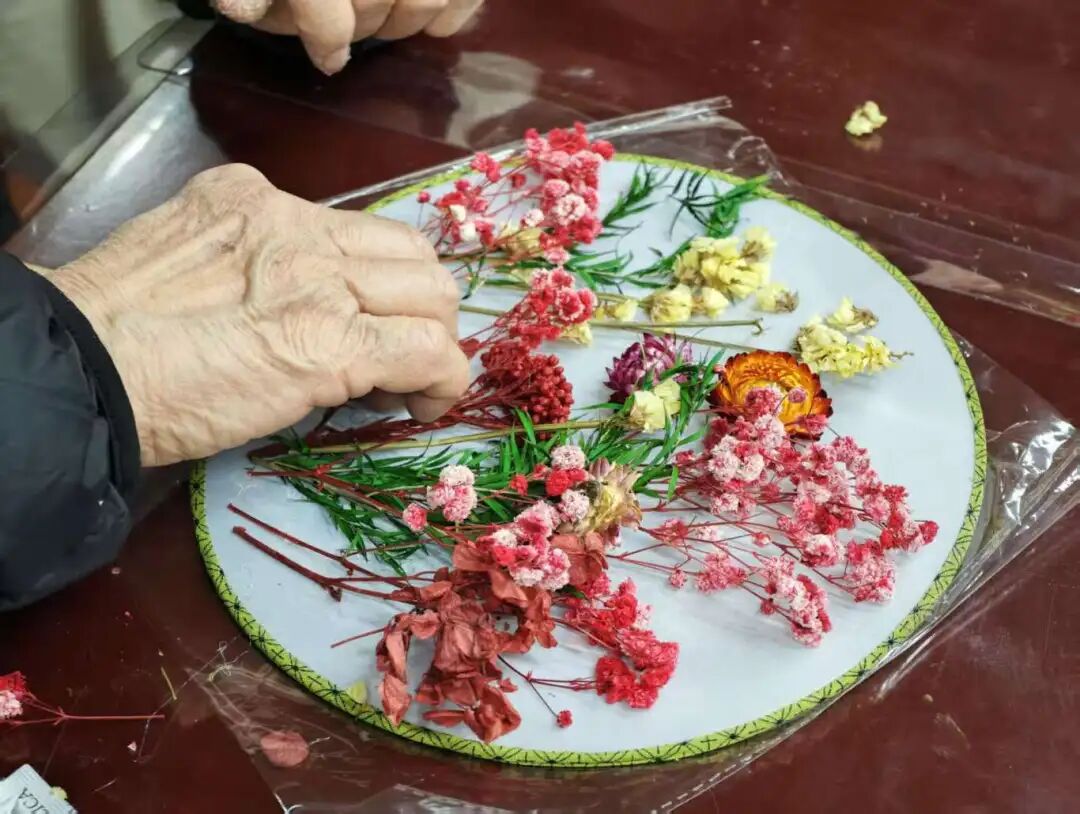 同步举行的古韵团扇手作体验同样趣味盎然、暖意浓浓。大家以扇为纸、以花为墨,将干花与枝叶精心粘贴、巧妙布局,细细勾勒、耐心点缀,一把把兼具雅致与创意的国风团扇次第呈现,尽显东方美学韵味。