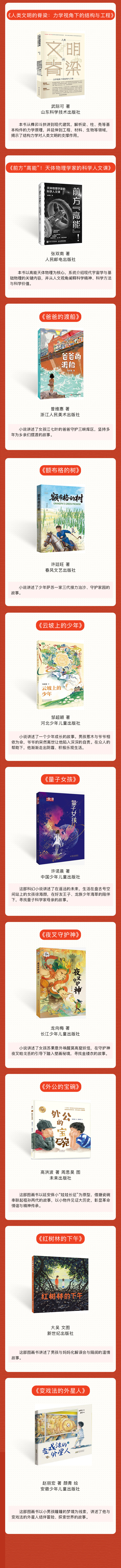 《望山河》《南海:历史与现实》《中国之名 星海之约:给重大科技成果冠上中国名》《大国小农:城市化进程中的农民》《中国早期城市与文明起源》《访古寻踪:文化遗产里的中国》《咸的玩笑》《橘红》《中国画艺术十讲》《王羲之:神采为上》《人类文明的脊梁:力学视角下的结构与工程》《前方“高能”!天体物理学家的科学人文课》《爸爸的渡船》《额布格的树》《云坡上的少年》《量子女孩》《夜叉守护神》《外公的宝碗》《红树林的下午》《变戏法的外星人》入选。