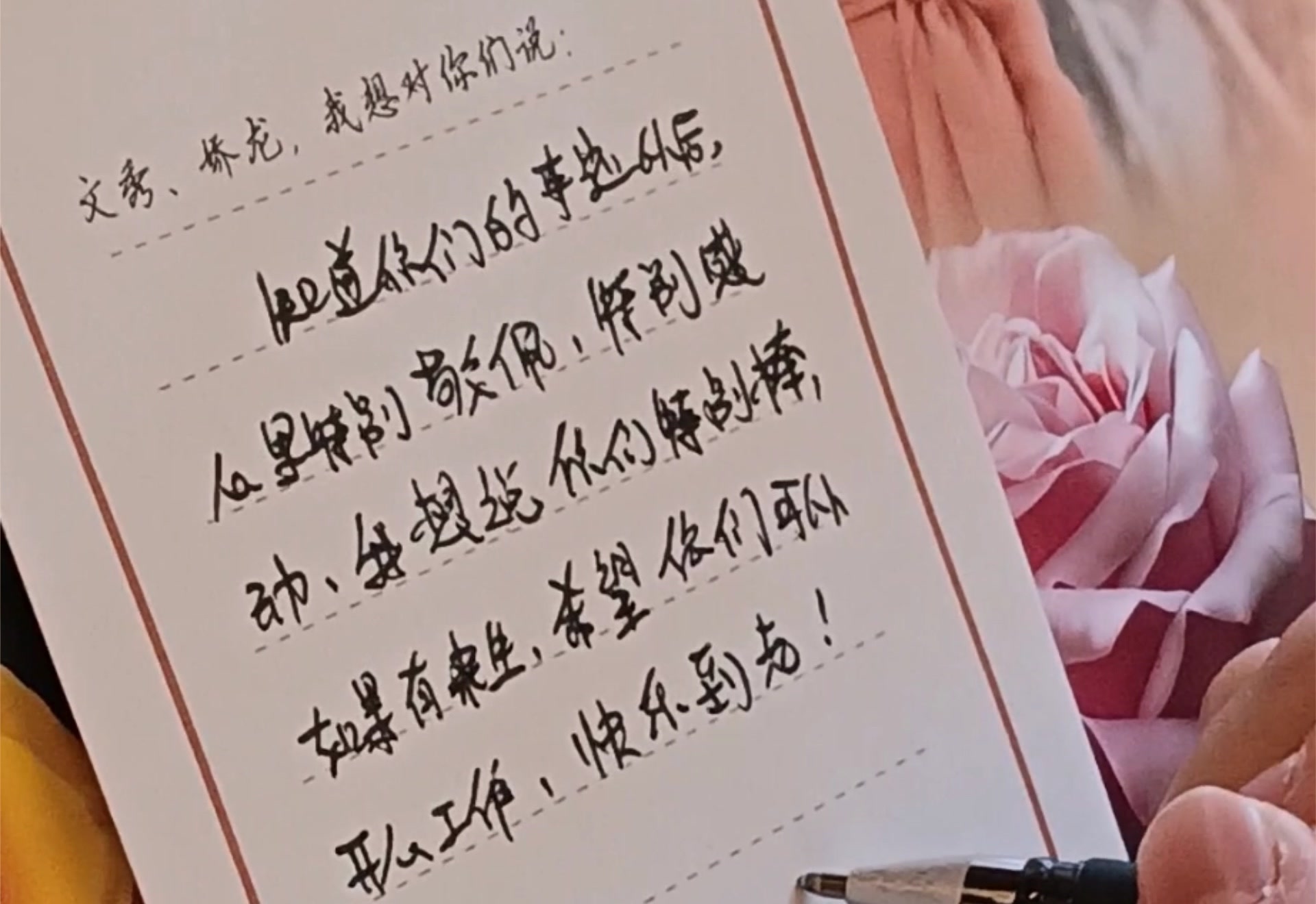 付玮烨说,在所有受访者中,最与众不同的祝福来自一位餐厅服务员。大姐说自己文化水平不高,不太会说话,但提到留言送祝福,她却好似心中早已有答案,在明信片上写下了“如果有来生,祝你们开心工作,快乐到老”的质朴文字。简简单单的一句话,深深触动了付玮烨的心。“人们不仅把她们当成楷模、英雄,更把她们当家人。”他感慨道。