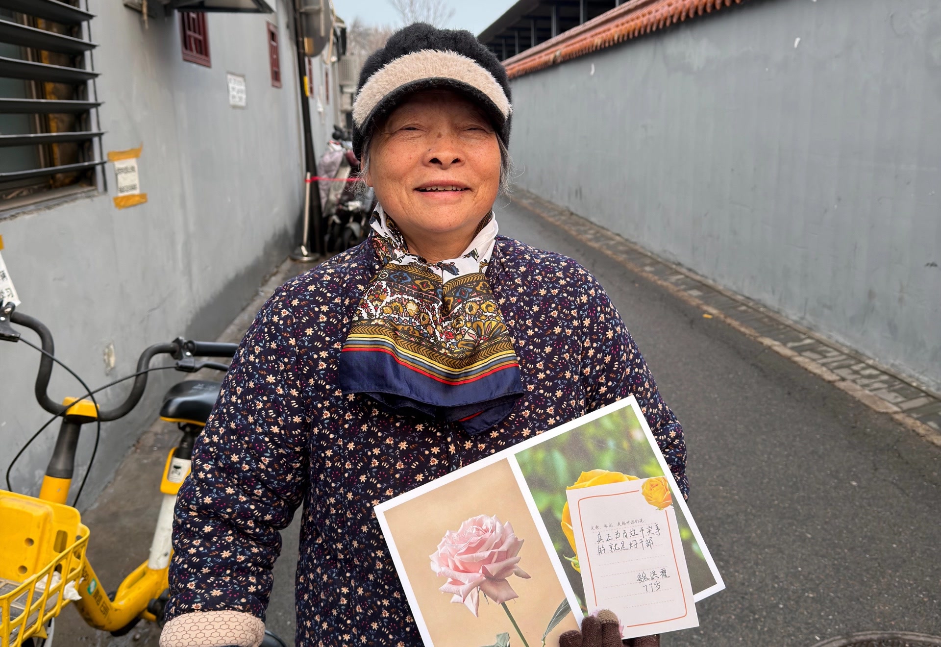 采访的当天,北京刚下完一场雪。在南锣鼓巷深处,付玮烨偶遇了77岁的魏洪霞老人。老人看着卡片说:“这样的人,这样的干部,老百姓忘不了,永远忘不了。”付玮烨说,那一刻,他也很想落泪。